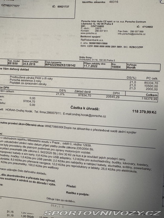 | Doplňující popis: | Koupeno nové v Porsche Bratislava, prodloužená záruka do 08/2025, polepeno celé do PPF ochranné folie, nikdy havarované, karbonové doplňky z GT2 RS . výdechy na předním blatníku, vstupy na zadním botaniku. Pravidelně servisové jen u Porsche , servisní dokumentace 2x klíč vše jak bylo k novému vozu. Olej měněn ve 4000km a poté po 5000km. Více informací po telefonu. Cena uvedena bez DPH, možnost odpočtu DPH. | |