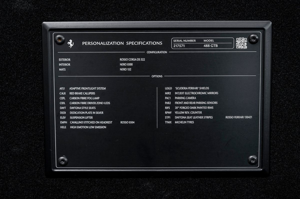 | Doplňující popis: | Ochranná transparentní PPF folie - přední část vozu, Exterior: Rosso Corsa DS 322, Interior: Nero 8500, Mats: Nero 152, Adaptive frontlight system, Red brake callipers, Carbon fiber fog lamp, Carbon fibre driver zone+leds, Daytona style seats, Dedication plate in silver, Suspension lifter, Cavallino stitched on headrest / Rosso 0504, High emotion low emission, Scuderia Ferrari shields, Int/ext electrochromatic mirrors, Parking camera, Front and rear parkings sensors, 20 forged dark painted rims, Yellow rev counter, Daytona seats leather stripes / Rosso Ferrari 130421 Michelin tyres, | |
