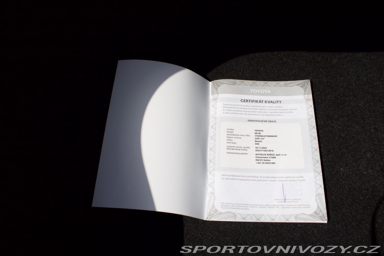 Doplňující popis: | Ponúkam na predaj toto štýlové športové coupe TOTOTA GR86, ktoré je určené predovšetkým pre nadšencov športovej jazdy o ktorú sa postará dostatočný výkon a krásny zvuk v kombinácií s pohonom zadnej nápravy. Vozidlo bolo kúpené ako nové na slovensku v novebri 2023 a má aktuálne najazdených iba 9250 km. Je v stave nového auta. ----- Vozidlo prešlo kontrolou poisťovacích záznamov, exekučných záznamov, kontrolou merania laku a dokladov. Skontrolované fyzicky, aj prostredníctvom registra prevádzkových záznamov vozidla. ----- Ponúkame možnosť výhodného financovania na mesačné splátky, takže si svoje nové vozidlo môžete užívať hneď, bez zbytočného čakania s akontáciou od 0% a splátkami až na 96 mesiacov. ----- Pre vaše väčšie pohodlie a istotu vieme zabezpečiť aj predĺženú záruku až na 12 – 36 mesiacov. ----- Ak už máte vlastné auto, nemusíte riešiť jeho predaj – vezmeme ho od vás priamo do protihodnoty. Stačí, keď s ním prídete k nám, my ho ohodnotíme a jeho cenu vám odpočítame z hodnoty nového vozidla. Vy tak ušetrite čas, starosti aj peniaze a celý proces prebehne rýchlo a jednoducho – odchádzate rovno na novom aute bez zbytočného vybavovania. ----- Vozidlo sa nachádza vo Vranove Nad Topľou - možný okamžitý odber. Viac informácií Vám radi poskytneme na telefónnom čísle 0911446446. | |