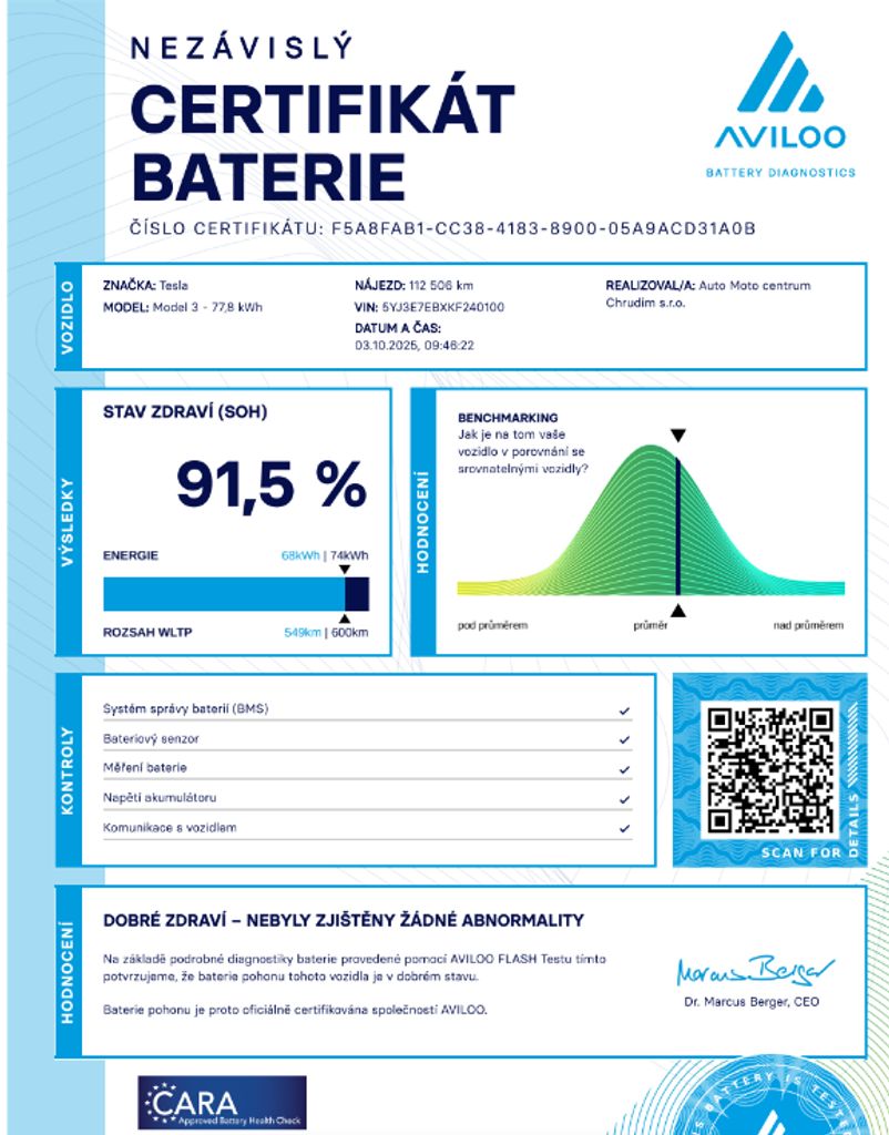 Doplňující popis: | Tesla Model 3 Long Range Dual Motor 350 kW SOH 91, 5% (ODPOČET DPH) - cena uvedena vč. DPH, baterie 78.8 kWh, dovoz: EU, VIN: 5YJ3E7EBXKF240100, elektro, do provozu: 28.3.2019, najeto: 112545 km, pohon kol: 4x4, automatická převodovka, STK do: 10/2027, WLTP 560km, klimatizace, procesor INTEL ATOM, klimatizace, panoramatická střecha. Záruka na Akumulátor a hnací ústrojí 8 let nebo po ujetí 192.000 km (podle toho, co nastane dříve).*MOŽNOST VYKOUPENÍ VAŠEHO STARÉHO VOZU PROTIÚČTEM* *MOŽNOST VÝHODNÉHO FINANCOVÁNÍ už bez nulové akontace* Pro nezávaznou kalkulaci nás neváhejte kontaktovat. Nutno vždy volat předem! Prohlídky možné i mimo pracovní dobu tel. 732710796 Mates auto, | |