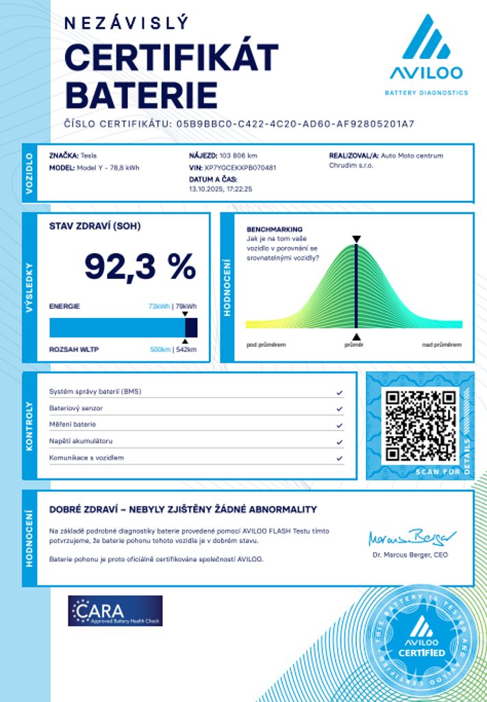 | Doplňující popis: | Tesla Model Y Long Range Dual Motor BERLÍN 378 kW SOH 92, 3 % (ODPOČET DPH) - cena uvedena vč. DPH, dovoz: Německo, VIN: XP7YGCEKXPB070481, elektro, do provozu: 10.3.2023, najeto: 103806 km, pohon kol: 4x4, automatická převodovka, STK do: 3/2027, WLTP 600 km, klimatizace, systém rozpoznávání dopravních značek, tepelné čerpadlo, procesor AMD RYZEN. Záruka na Akumulátor a hnací ústrojí vyprší 10.3.2031 nebo po ujetí 192.000 km (podle toho, co nastane dříve). *MOŽNOST VYKOUPENÍ VAŠEHO STARÉHO VOZU PROTIÚČTEM* *MOŽNOST VÝHODNÉHO FINANCOVÁNÍ už bez nulové akontace* Pro nezávaznou kalkulaci nás neváhejte kontaktovat. Nutno vždy volat předem! Prohlídky možné i mimo pracovní dobu tel. 732710796 Mates auto. Nejedná se o návrh na uzavření smlouvy (nabídku) dle § 1731 zákona č. 89/2012 Sb., občanský zákoník, ale o nezávaznou nabídku., | |