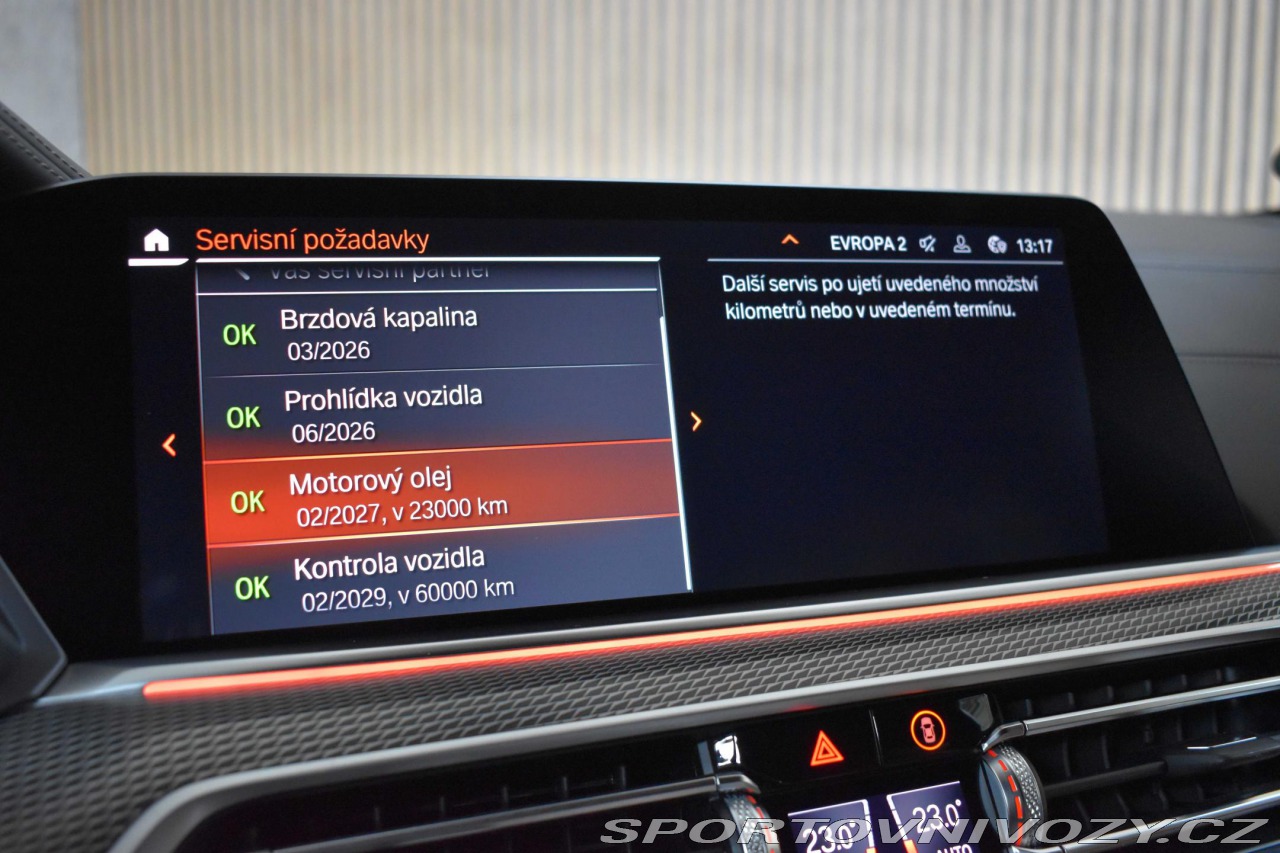 | Doplňující popis: | Vozidlo v tovární záruce do 22.6.2026! Registrované jako nové v ČR od 1.majitele, s možností odpočtu DPH. Pravidelně servisováno, příští servisní interval za 14 000 km. Historie vozidla prověřena společností CEBIA, na vyžádání lze zaslat Cebia report mailem. Z volitelné výbavy: M Sportovní výfukový systém, Sportovní brzda M, Sportovní diferenciál M, Integrální aktivní řízení, Adaptivní podvozek M Professional, M Sportovní paket, Tažné zařízení, BMW klíč s displejem, Panoramatická střecha elektrická, Zavazadlový prostor paket, Nastavení sedadla elektrické s pamětí, Sport.sedadlo, Komfortní balíček pro vyhřívání přední, Autom. klimatizace se 4zónovou regulací, Rozšířený paket zrcátek, Nezávislé topení, Dálkové světlo asistent, Aktivní ochrana, Active Guard Plus, Driving Assistant Professional, Systém parkovací asistence Plus, DAB tuner (DAB+ způsobilý), Harman/Kardon Surround Sound System, Connected Drive Services, Connected Package Professional, BMW Live Cockpit Professional, BMW ovládání posunky, Volant s koženým potahem M, M aerodynamický paket, Strop karoserie antracit, Aktivní ochrana chodců. Tato nabídka má pouze informativní charakter a neslouží jako podklad pro uzavření objednávky. STOP CARS s.r.o. si vyhrazuje právo uzavření všech smluvních vztahů písemně. | |