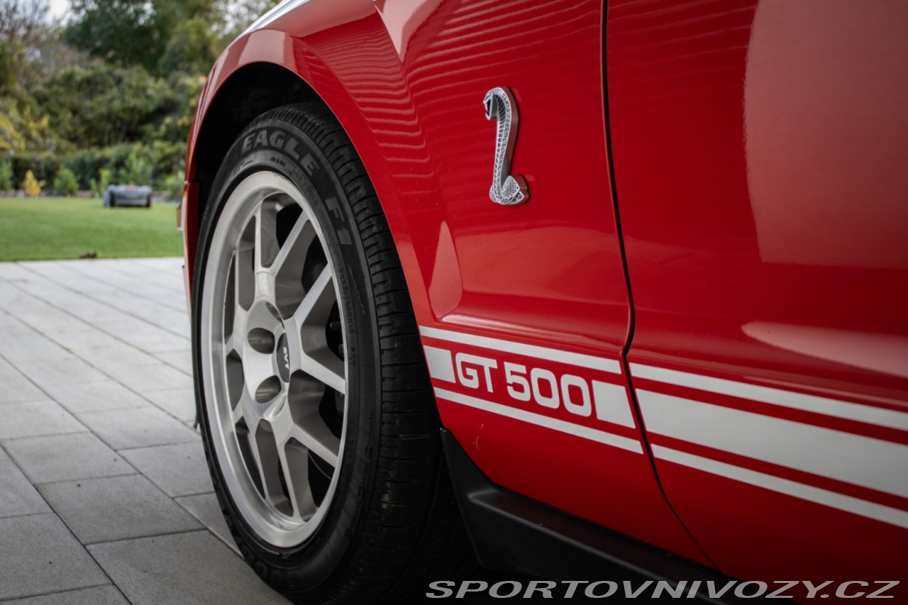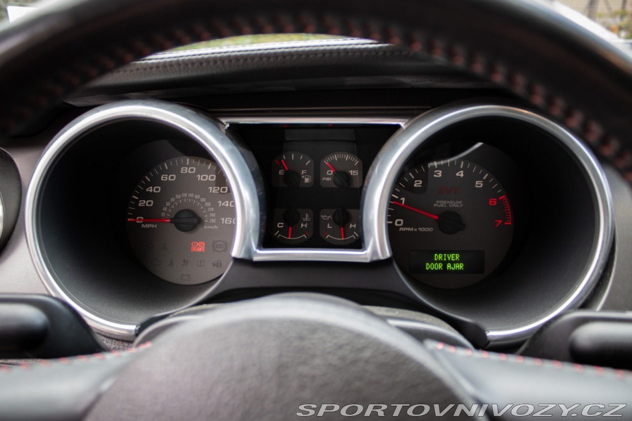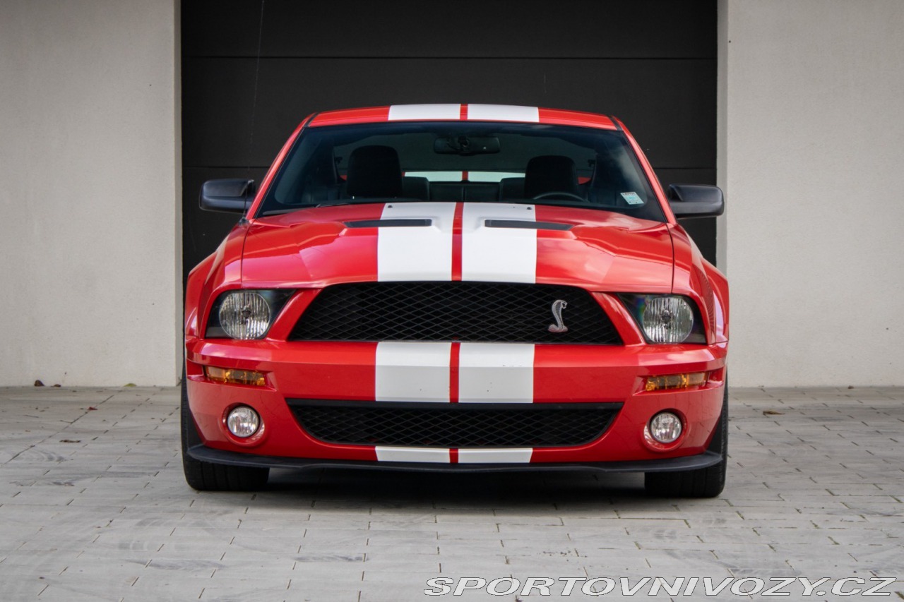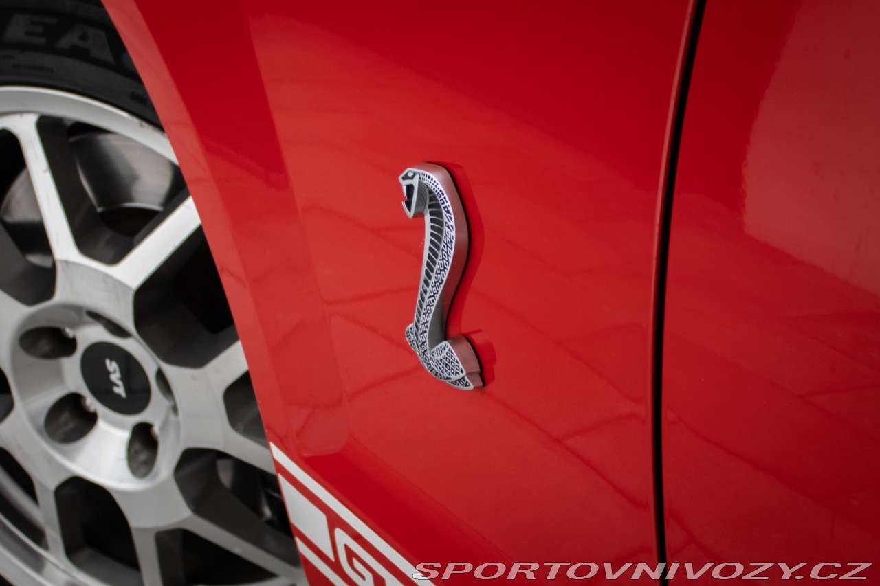 | Nadstandardní výbava: | Usporiadanie: V8 (8 valcov do V, uhol 90) Rozvod: DOHC (Double Overhead Camshafts) – 4 ventily na valec Preplňovanie: mechanický kompresor (Eaton M122 Supercharger) Krútiaci moment: približne 480 lb-ft (651 Nm) pri ~4500 rpm. Výkon: približne 500 hp (373 kW) pri ~6000 rpm. Spotreba (orientačne): kombinovaná ~12–16 mpg (záleží na štýle jazdy). Originálne 18 disky Shelby, Limitovaný sklz diferenciálu (LSD), Športový podvozok SVT, špecifické tlmiče a pružiny, Kožené športové sedačky s logom cobra, elektrické nastavenie, Originálne bodykit Shelby, predný a zadný nárazník, zadný spojler, prahové lišty, Trakčný systém TCS Výbava: ABS, Airbagy, Airbagy - počet, Alarm, Centrálne zamykanie, EBD, Autorádio, Diaľkové ovládanie zamykania, Elektrické okná, Klimatizácia, Kožený interiér, Kožený paket, Lakťová opierka, Multifunkčný volant, Palubný počítač, Hliníkové disky, Hmlovky | |