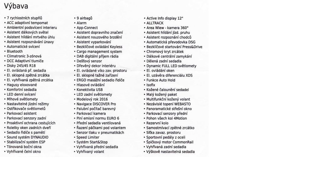 Bohata vybava napr. Full LED vpredu i vzadu, automat. dalkova (HBA) + vyrezavani protijedoucich vozidel (DLA), Dynaudio, elektricky sklopne tazne do 2200 kg,