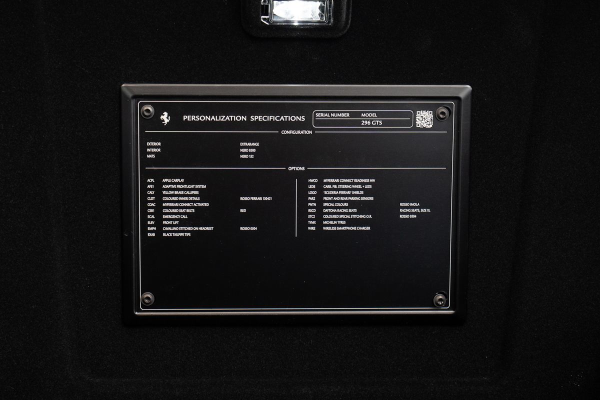 | Doplňující popis: | Čislo inzerce: ZL.xxx.321, Lak karoserie Rosso Imola, Interiér v barvě Nero, Apple CarPlay, Adaptivní přední světlomety, Žluté brzdové třmeny, Barevné interiérové detaily (Rosso Ferrari), Služba MyFerrari Connect aktivována, Barevné bezpečnostní pásy (červené), Přední zvedání (Front Lift), Vyšitý Cavallino na opěrkách hlavy (Rosso 0504), Černé koncovky výfuku, Příprava MyFerrari Connect, Volant z karbonového vlákna s LED diodami, Znak „Scuderia Ferrari“ na blatnících, Přední a zadní parkovací senzory, Speciální lakování (Rosso Imola), Sedadla Daytona Racing (velikost XL), Speciální kontrastní prošívání (Rosso), Bezdrátová nabíječka telefonu | |