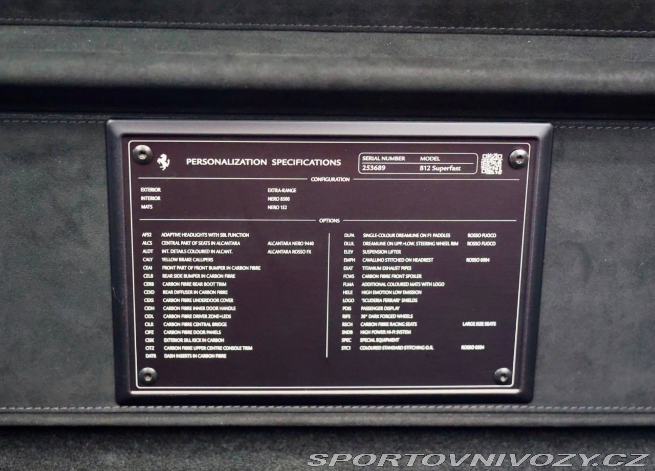 | Nadstandardní výbava: | Kľúčové informácie: - Ohromujúca špecifikácia! - Lak Rosso Fuoco - Interiér Alcantara Nera - Pretekárske sedadlá Corsa Carbon - Kompletná história - NEW POWER Záruka 09-2027 Príbeh: Model 812 Superfast posúva odkaz modelu F12 na vyššiu úroveň a prináša mimoriadny výkon a jedinečne pohlcujúci zážitok z jazdy. Jeho dizajn je nezameniteľne Ferrari, s LED svetlometmi a zadnými svetlami a aerodynamickými detailmi inšpirovanými modelom F12, vrátane moderných interpretácií Aerobridges. Interiér kombinuje prvky modelov F12 Berlinetta a LaFerrari a vytvára tak zameraný kokpit s prepracovanými materiálmi. Tento exemplár vyniká svojou ohromujúcou špecifikáciou. Exteriér Rosso Fuoco zvýrazňuje každú krivku, doplnený karbónovými komponentmi, ktoré dodávajú výraz a precíznosť. Štítky Scuderia Shields podčiarkujú jeho dedičstvo. V interiéri karbónové pretekárske sedadlá Corsa potiahnuté Alcantarou Nera s červenými akcentmi odrážajú exteriér. Karbónové detaily, vložky Rosso Alcantara a prepracované prešívanie vytvárajú súdržnú a dramatickú atmosféru, ktorú zvýrazňujú akcenty Rosso na vetracích otvoroch a pruh na volante vo farbe karosérie. 6,5-litrový motor V12 poskytuje výkon 800 koní a krútiaci moment 718 Nm, vďaka čomu zrýchli model 812 z nuly na sto za 2,9 sekundy a dosiahne rýchlosť 340 kilometrov za hodinu. Riadenie zadných kolies, elektronický posilňovač riadenia a pokročilá aerodynamika zabezpečujú pozoruhodnú agilitu. Tento model 812 Superfast, dodaný a udržiavaný spoločnosťou Scuderia Prague, s nedávnym servisom najazdeným 9 634 kilometrami, je vo vynikajúcom stave a pripravený na jazdu. História servisu: Servis 1: 05-2022 / 2 494 km Servis 2: 05-2023 / 6 202 km Servis 3: 08-2024 / 8 058 km Servis 4: 07-2025 / 9 634 km Záruka na nový výkon: 09-2027 Výbava: - Kontrola trakcie F1 s integráciou SSC - Virtuálny krátky rázvor (PCV) so zadnými volantmi - Progresívny elektrický posilňovač riadenia - Integrovaná kontrola dynamiky vozidla (Race Manettino) - Magnetorheologicky riadené odpruženie (MagneRide Gen 3) – ovládanie cez manettino - Karbónovo-keramický brzdový systém (CCM4) - Performance Launch Control - Dvojstupňové predné airbagy vodiča a spolujazdca - 20-palcové disky z ľahkých zliatin - Full LED svetlomety - Okrúhle zadné svetlá s dvojitou karosériou LED - Tlačidlo štartovania motora na volante - Tempomat - Dažďový senzor a súmrak senzor - Dvojzónová klimatizácia - Proti krádeži - Predné a zadné parkovacie senzory - Elektrochromatické, vyhrievané a elektricky sklopné vonkajšie spätné zrkadlá - Elektrochromatické vnútorné spätné zrkadlo - 8-smerové elektricky nastaviteľné sedadlá - Vertikálne sklopná zadná lavica - Plachta auta - Udržiavač nabíjania - Detaily priestoru pre cestujúcich z Alcantary® vo farbe podľa výberu zákazníka - Brzdové strmene Giallo Modena - Nasávací otvor v prednom nárazníku z uhlíkových vlákien - Spodná časť zadného nárazníka z uhlíkových vlákien - Spodný kryt zadného skla - Uhlíkový difúzor - Obloženie pod dverami z uhlíkových vlákien - Vonkajšie prahové lišty z uhlíkových vlákien - Predný tunel z uhlíkových vlákien - Titánové koncovky výfuku - Predný spojler z uhlíkových vlákien - Koberce s vyšívaným logom vozidla - Štíty Scuderia Ferrari na blatníkoch - Displej pre spolujazdca - 20-palcové kované kolesá, matná farba Grigio Corsa - Stredná časť sedadiel z Alcantary® - Vnútorné kľučky dverí z uhlíkových vlákien - Obloženie z uhlíkových vlákien, priestor vodiča a LED indikátory radenia na volante - Stredová konzola z uhlíkových vlákien - Pannelli Porta v farbe Carbonio - Farba koberca - Prístrojová doska z uhlíkových vlákien Akcenty - Páčky Dreamline F1 – 1 farba - Horný a dolný oblúk Dreamline - Vyšívaný emblém Cavallino na opierke hlavy - Pretekárske sedadlá Corsa z uhlíkových vlákien - Štandardné prešívanie vo farbe podľa výberu zákazníka - AFS2 (adaptívny systém predných svetiel) - Zdvih predného a zadného odpruženia - Systém HELE (High Emotion Low Emission) - Prémiový Hi-Fi systém - Špeciálne funkcie - atd Výbava: ABS, ADS, Airbagy, Airbagy - počet, Alarm, ASR, Brzdový asistent, Centrálne zamykanie, DSC, EBD, EBV, ESP, Imobilizér, Natáčacie svetlomety, Parkovacia kamera, Systém kontroly tlaku v pneumatikách (TPMS), Varovanie o vzdialenosti (BAS Plus), Systém tiesňového volania (e-Call), Upozornenie premávky za vozidlom (RCTA), Asistent diaľkových svetiel (HBA), Autorádio, Adaptívny podvozok, Bezkľúčové štartovanie, Bluetooth handsfree, Diaľkové ovládanie zamykania, Elektrické okná, Elektrické sedadlá, Elektrické zrkadlá, Klimatizácia, Klimatizovaná priehradka, Kožený interiér, Kožený paket, Lakťová opierka, LED svetlomety, LED svietenie, Multifunkčný volant, Navigačný systém, Palubný počítač, Pamäťové sedačky, Parkovacie senzory, Posilňovač riadenia, Tempomat, Vyhrievané sedačky, Vyhrievané zrkadlá, Vonkajší teplomer, Welcome light, Radenie pod volantom, Ambientné osvetlenie, Asistent jazdných pruhov, Dažďový senzor, Hliníkové disky, Kontrola mŕtveho uhla, Svetelný senzor | |
