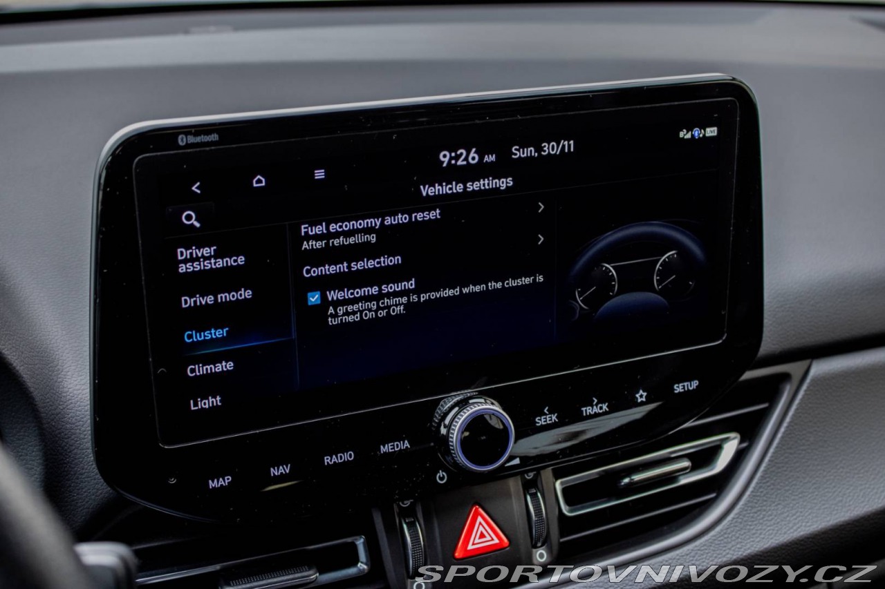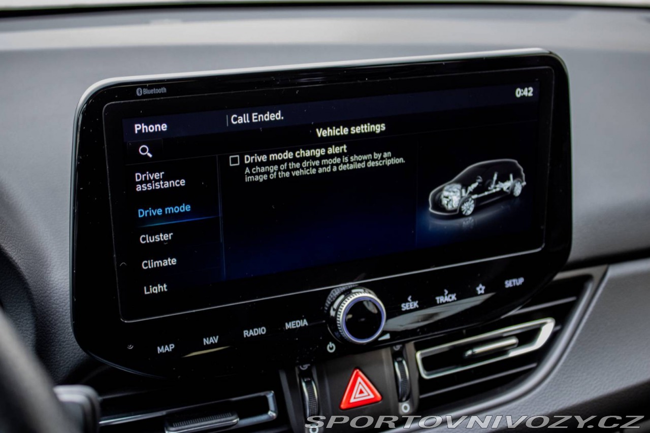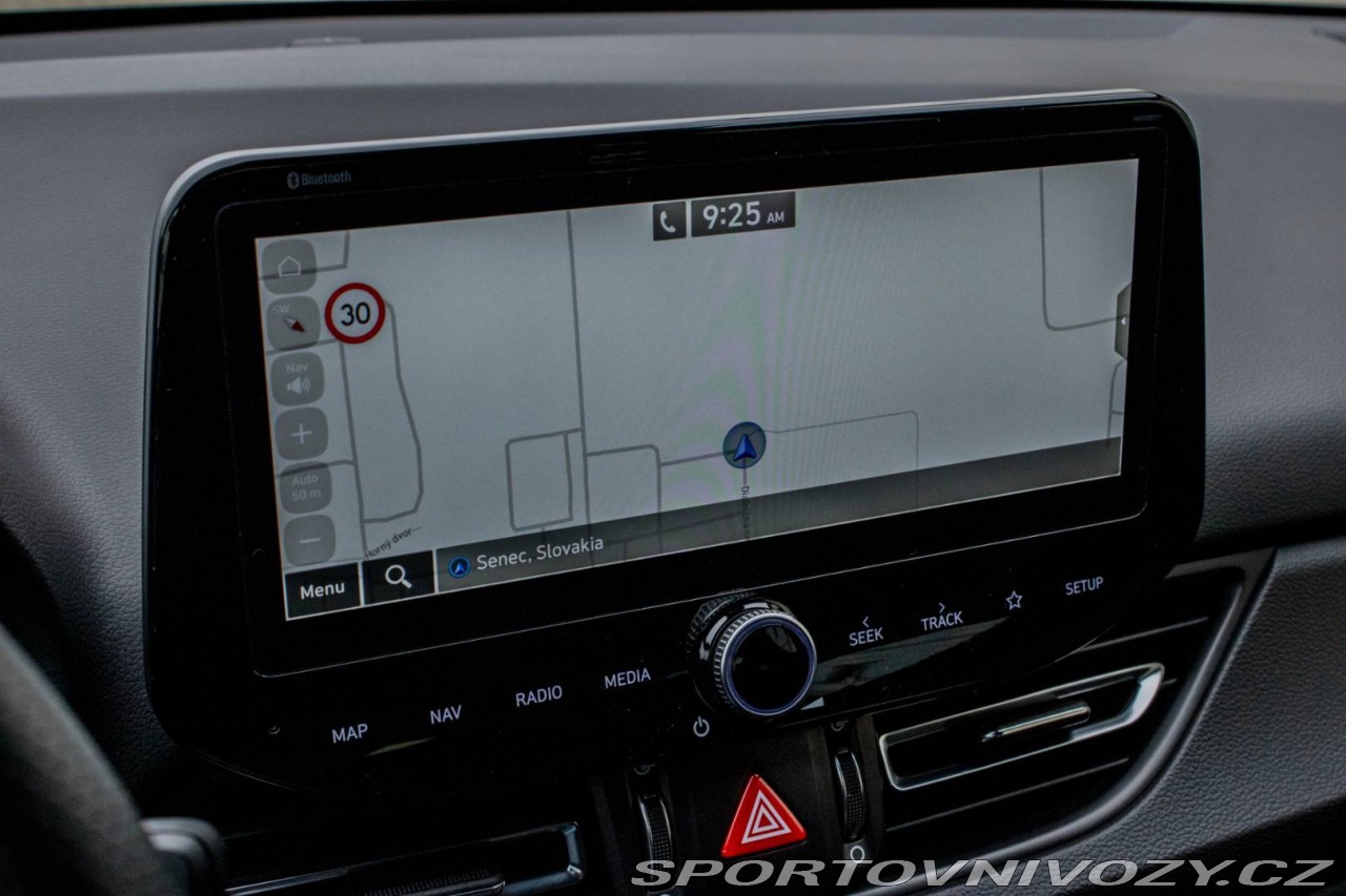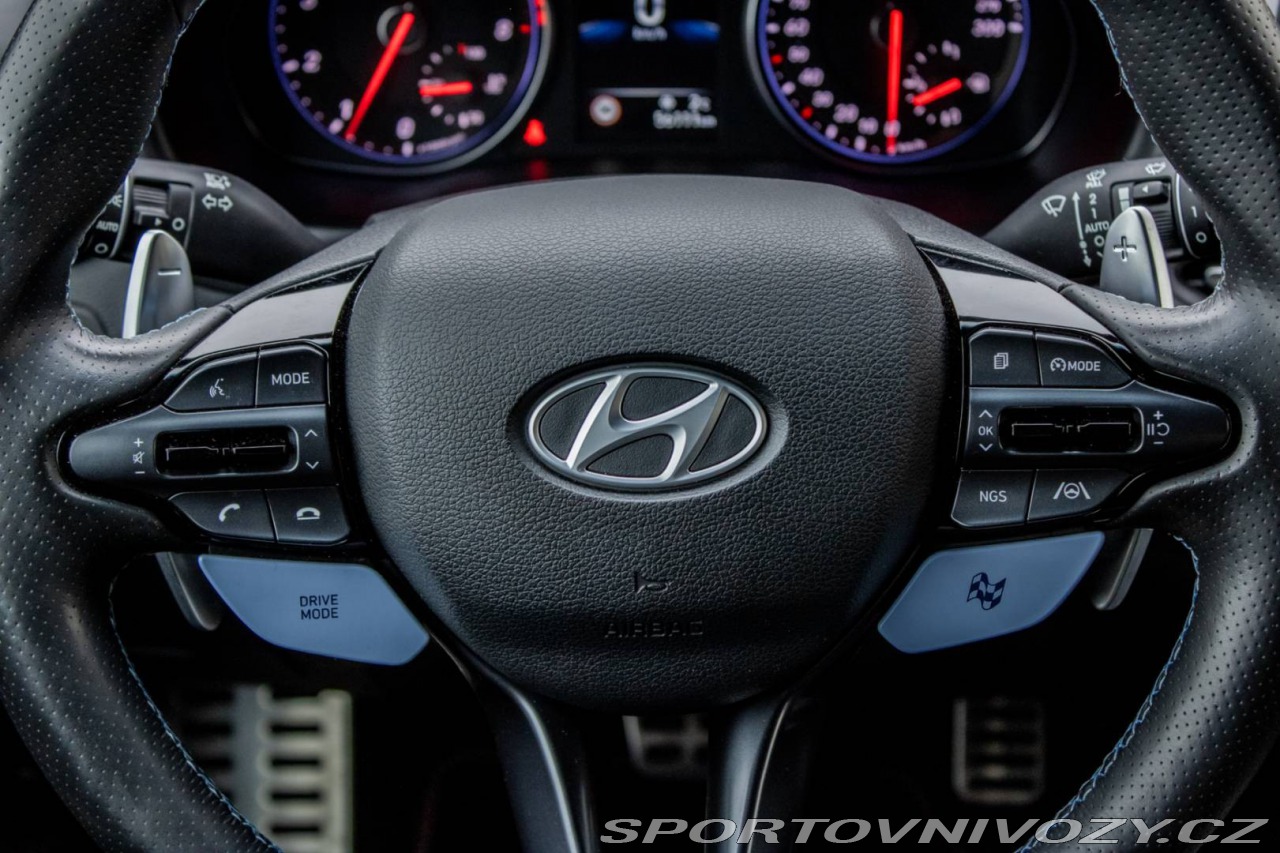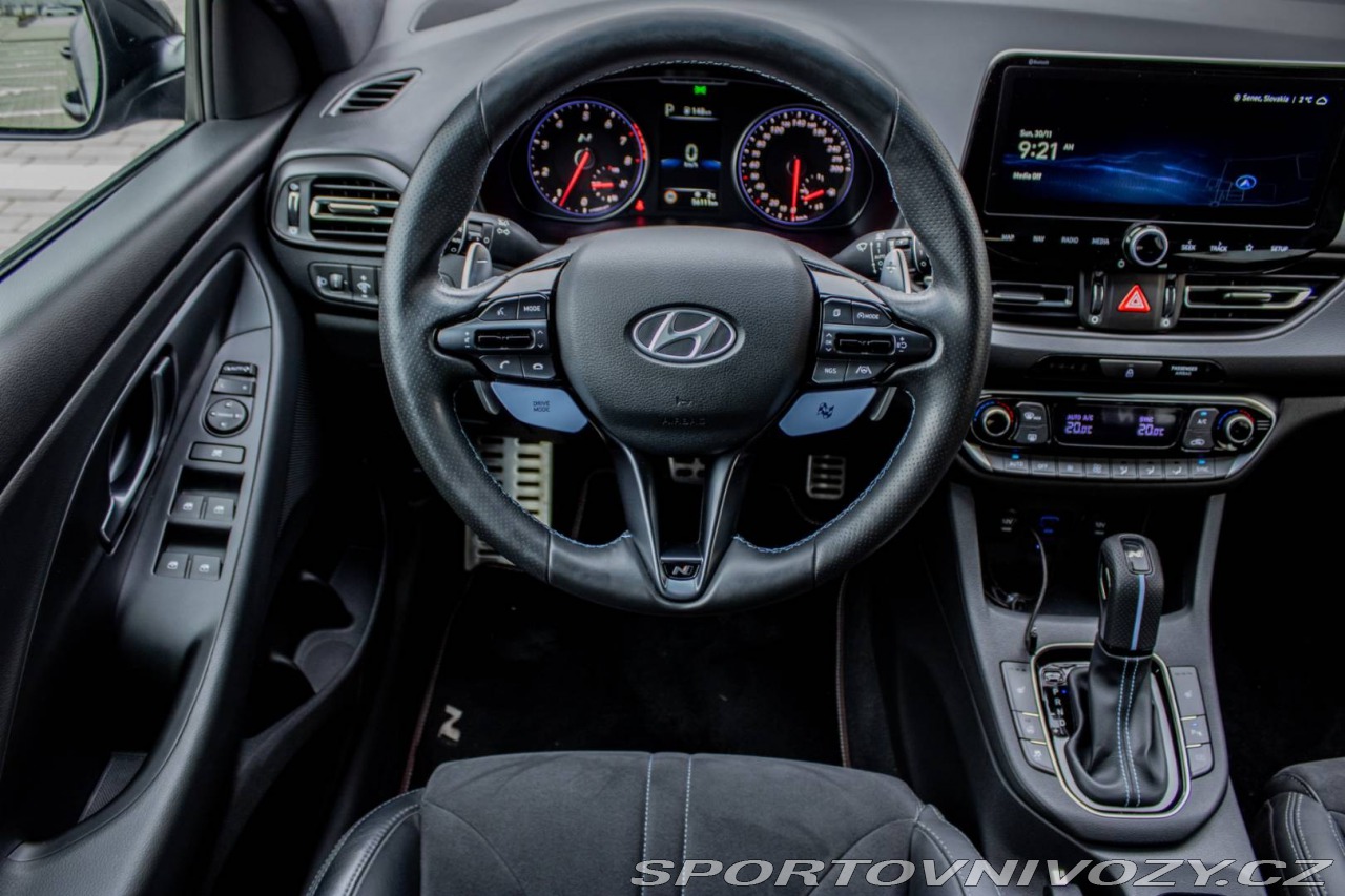 | Nadstandardní výbava: | Asistent rozjazdu 'LAUNCH CONTROL', Elektrický posilňovač riadenia R-MDPS, Kovové pedále a N hlavica radiacej páky prevodovky, N Palubný počítač s rozšírenými funkciami nastavenia motora a podvozku, N body kit - predná N maska s logom - predné svetlomety N dizajn - predný a zadný športový nárazník s červenou linkou - prahové nástavce lakované v čiernej farbe s logom N - tretie LED brzdové svetlo N dizajn - integrovaný športový spojler lakovaný v čiernej farbe - dvojitá koncovka výfuku po stranách, N športový volant čalúnený perforovanou kožou s ovládačmi režimu jazdy (Drive Mode/N Mode), Podvozok s adaptívnymi tlmičmi ECS, Predné FULL LED svetlomety so statickým LED prisvecovaním zákrut Výbava: ABS, ADS, Airbagy, Airbagy - počet, Alarm, ASR, Brzdový asistent, Centrálne zamykanie, Deaktivácia airbagov, DSC, EBD, EBV, ESP, Imobilizér, Isofix, Parkovacia kamera, Systém kontroly tlaku v pneumatikách (TPMS), Asistent rozpoznávania dopravných značiek (ISLW/ISLA), Varovanie o vzdialenosti (BAS Plus), Systém rozpoznania únavy vodiča (DAW), Systém tiesňového volania (e-Call), Upozornenie premávky za vozidlom (RCTA), Asistent diaľkových svetiel (HBA), Autorádio, Adaptívny podvozok, Bezkľúčové otváranie dverí, Bezkľúčové štartovanie, Bluetooth handsfree, Diaľkové ovládanie zamykania, Dotykový displej, Elektrické okná, Elektrické zrkadlá, Fólie, Klimatizácia, Lakťová opierka, LED svetlomety, LED svietenie, Multifunkčný volant, Navigačný systém, Palubný počítač, Parkovacie senzory, Posilňovač riadenia, Tempomat, Vyhrievané sedačky, Vyhrievaný volant, Vonkajší teplomer, Apple CarPlay, Android Auto, Welcome light, Radenie pod volantom, Asistent jazdných pruhov, Asistent rozjazdu do kopca, Dažďový senzor, Hliníkové disky, Kontrola mŕtveho uhla, Ostrekovače svetlometov, Sezónne prezutie, Stop&start systém, Svetelný senzor | |