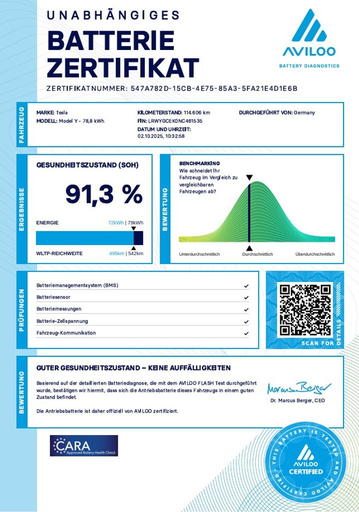 | Doplňující popis: | Tesla Model Y Long Range Dual Motor 378 kW SOH 91, 3 % (ODPOČET DPH) - cena uvedena vč. DPH, baterie 78.8kWh - LRWYGCEK0NC461535, dovoz: Německo, elektro, do provozu: 30.9.2022, najeto: 114613 km, pohon kol: 4x4, automatická převodovka, STK do: 9/2027, vyhřívaná přední i zadní sedadla, vyhřívaný volant, parkovací kamera, procesor AMD RYZEN, tepelné čerpadlo, MATRIX SVĚTLOMETY, BOOM BOX, WLTP 560 km. Záruka na Akumulátor a hnací ústrojí 8 let nebo po ujetí 192.000 km (podle toho, co nastane dříve), plná záruka do 29.9.2026/80000 km (podle toho, co nastane dříve). *MOŽNOST VYKOUPENÍ VAŠEHO STARÉHO VOZU PROTIÚČTEM* *MOŽNOST VÝHODNÉHO FINANCOVÁNÍ už bez nulové akontace* Pro nezávaznou kalkulaci nás neváhejte kontaktovat. Nutno vždy volat předem! Prohlídky možné i mimo pracovní dobu tel. 732710796 Mates auto. Nejedná se o návrh na uzavření smlouvy (nabídku) dle § 1731 zákona č. 89/2012 Sb., občanský zákoník, ale o nezávaznou nabídku., | |