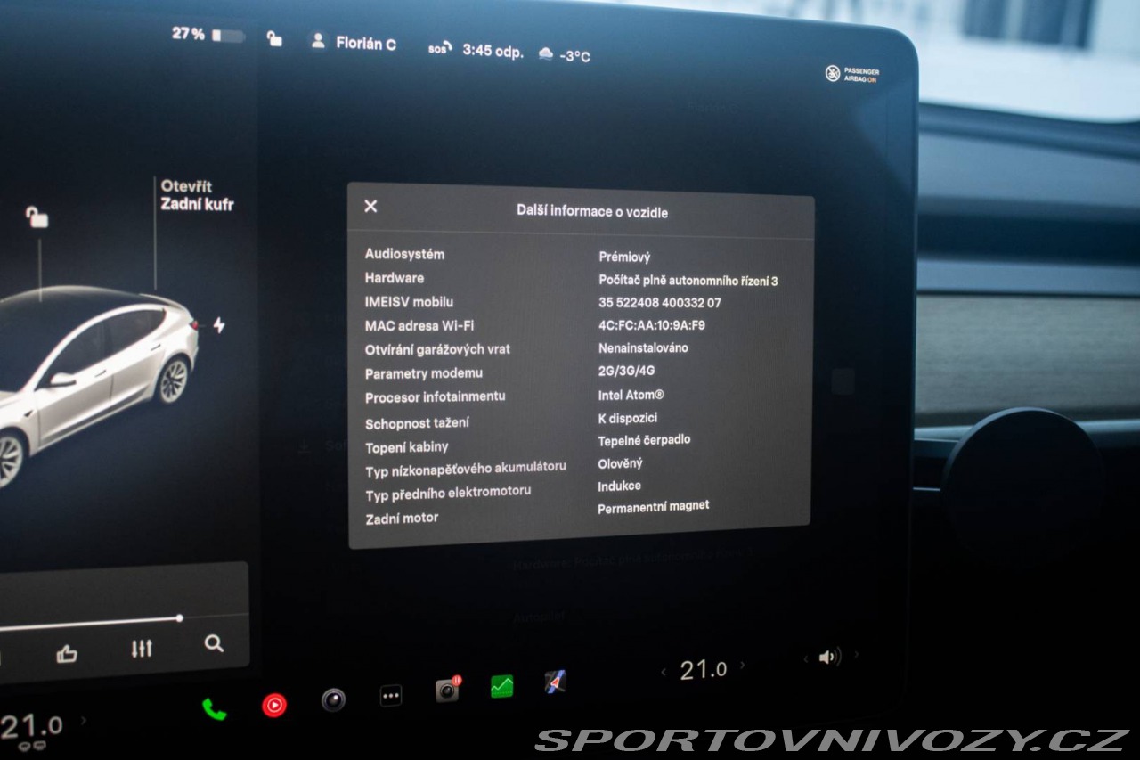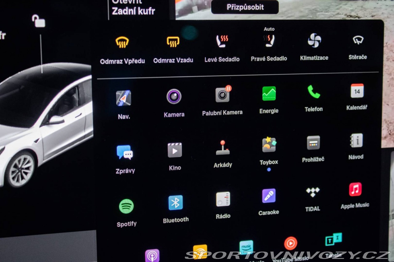 | Nadstandardní výbava: | elektricky sklopné spätné zrkadlá, panoramatická strecha, tepelné čerpadlo, LED matrix svetlomety s automatickým vyrezávaním, prémiový audiosystém, USB-C porty + bezdrôtové nabíjanie pre smartphony, nové odnímateľné ťažné zariadenie (nepoužívané), spätné zrkadlá lakované v bielej farbe kľučky dverí v čiernej farbe, vyhrievané zadné sklo, držiaky na poháre, najnovšia verzia Tesla softvéru, Výbava: ABS, Adaptívny tempomat, Airbagy, Alarm, Brzdový asistent, Centrálne zamykanie, Deaktivácia airbagov, EBD, ESP, Imobilizér, Isofix, Parkovacia kamera, Systém kontroly tlaku v pneumatikách (TPMS), Asistent rozpoznávania dopravných značiek (ISLW/ISLA), Varovanie o vzdialenosti (BAS Plus), Systém rozpoznania únavy vodiča (DAW), Systém tiesňového volania (e-Call), Upozornenie premávky za vozidlom (RCTA), Asistent diaľkových svetiel (HBA), Autorádio, Bezdotykové otváranie kufra, Bezkľúčové otváranie dverí, Bezkľúčové štartovanie, Bluetooth handsfree, Diaľkové ovládanie zamykania, Dotykový displej, Elektrické okná, Elektrické sedadlá, Elektrické zrkadlá, Elektrické ovládanie kufra, Fólie, Klimatizácia, Kožený interiér, Lakťová opierka, LED svetlomety, LED svietenie, Multifunkčný volant, Navigačný systém, Palubný počítač, Parkovacie senzory, Vyhrievané predné sklo, Vyhrievané sedačky, Vyhrievané zrkadlá, Vonkajší teplomer, Apple CarPlay, Android Auto, Welcome light, WLAN / Wifi Hotspot, Virtuálny kokpit, Radenie pod volantom, Matrix svetlá, Bezdrôtové nabíjanie pre smartphony, Ambientné osvetlenie, Asistent rozjazdu do kopca, Dažďový senzor, Hliníkové disky, Hmlovky, Kontrola mŕtveho uhla, Panoramatická strecha, Stop&start systém, Svetelný senzor, Ťažné zariadenie | |