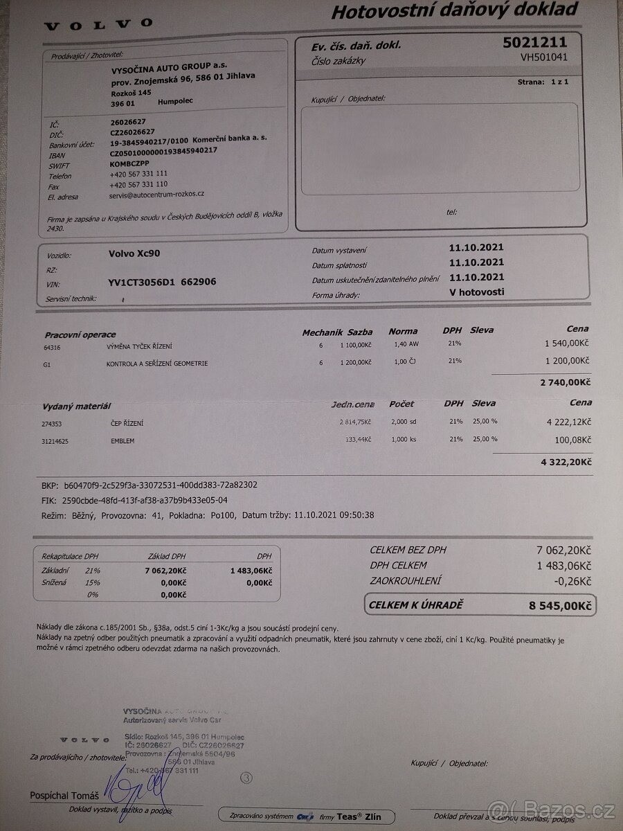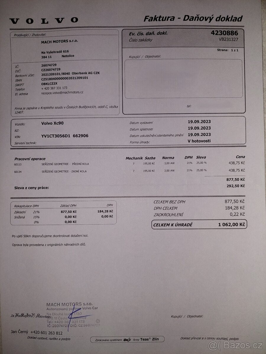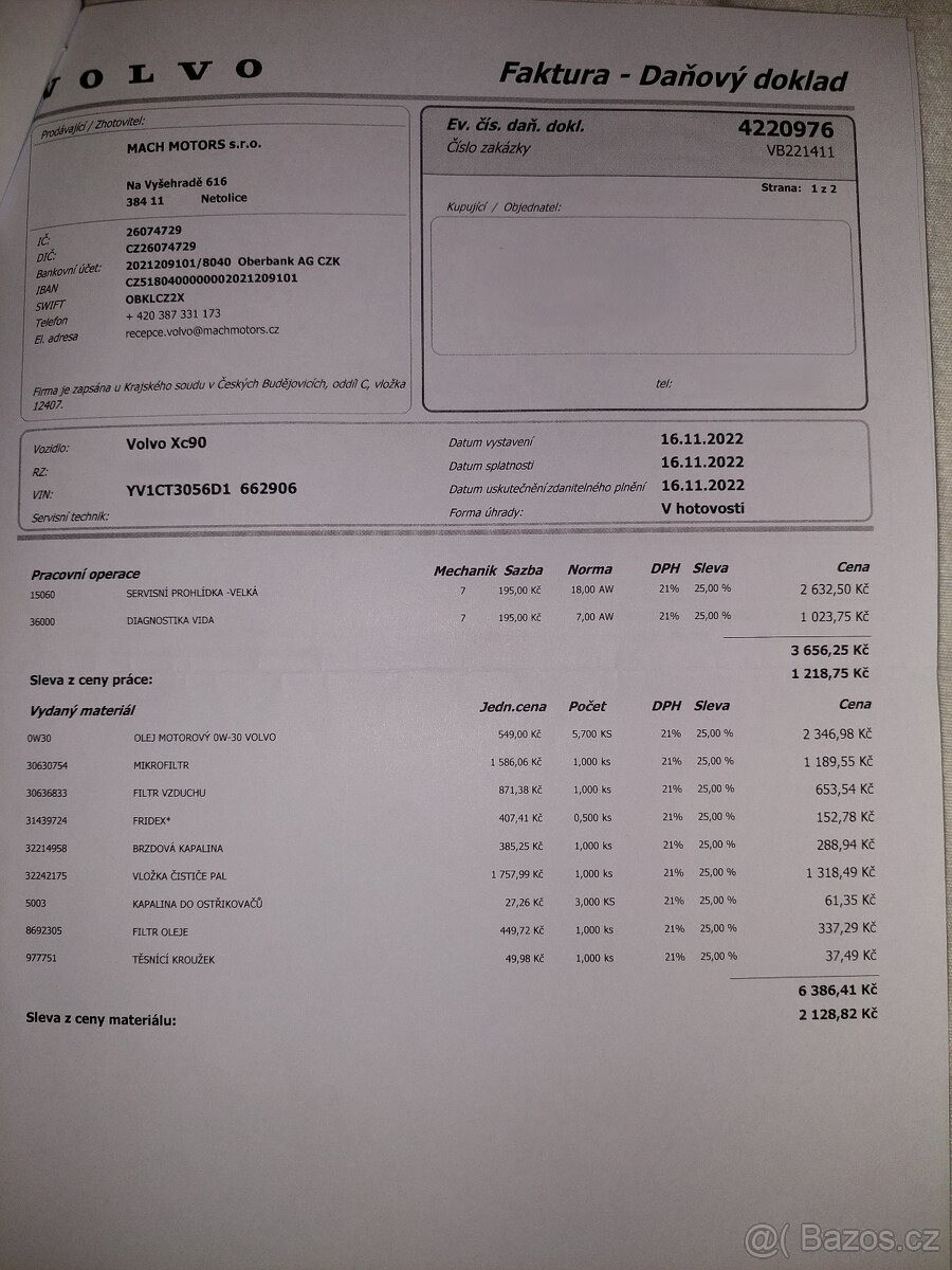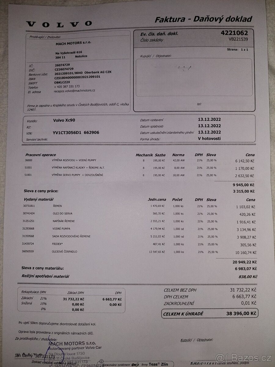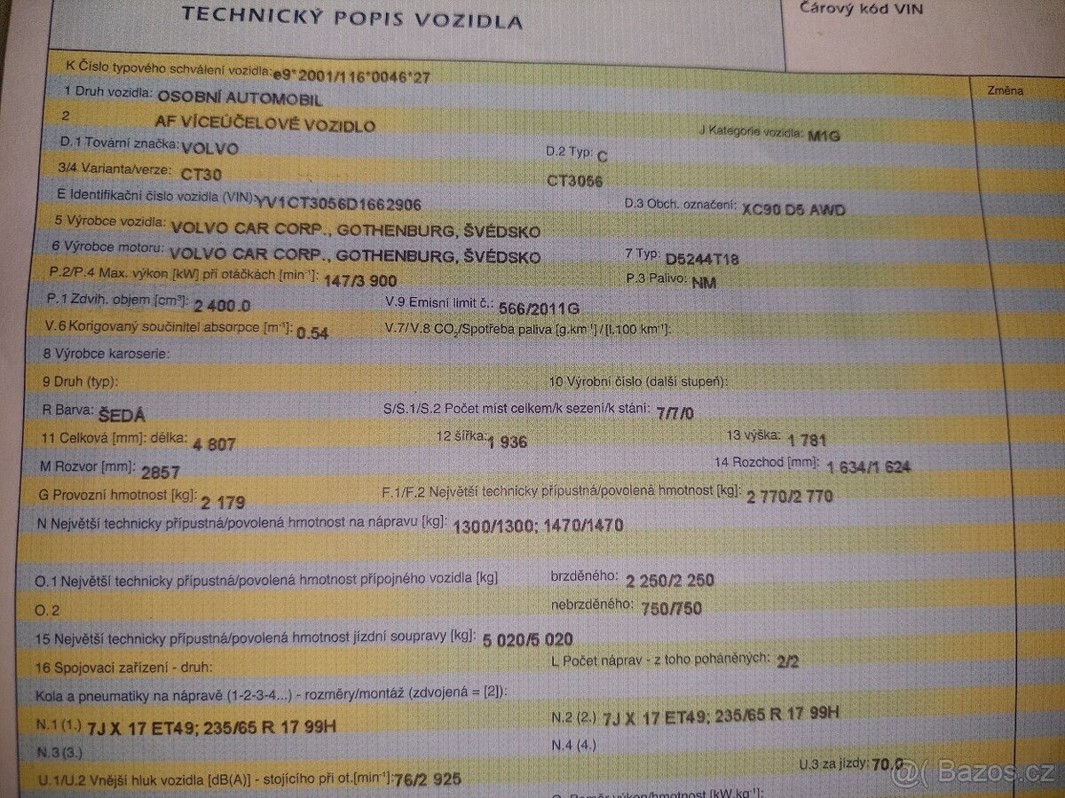 | Doplňující popis: | TEL: 776114718 OKR: JINDŘICHŮV HRADEC Prodám velmi zachovalé (vzhledem ke stáří) Volvo XC90 AWD R-Design se spolehlivým motorem 2.4 D5 (147 kW), 7místné. VIN: YV1CT3056D1662906 Nájezd: cca 255 000 km (auto je stále v provozu) 1. registrace: 7.1.2013 Registrace v ČR: 25.11.2020 (od té doby jsem majitelkou) Garážované: posledních 5 let STK: platná do 25.11.2026 Výbava a stav: Automatická převodovka Pohon všech kol (AWD) Vyhřívaná přední sedadla Aktuálně na zimních pneu, navíc k vozu sada letních pneumatik po jedné sezóně Chybí krytka ostřikovače předního světlometu, viz foto - sháním náhradní. Servis: Přikládám kopie faktur z autorizovaného servisu za dobu mého vlastnictví 12/2025 provedena výměna převodového oleje a žhavicích svíček. 01/2026 při 255tis km provedena výměna motorového oleje. Důvod prodeje: V rodině již nevyužijeme druhé auto s dieselovým motorem. Jedná se však o velmi spolehlivý vůz, se kterým se budu jen těžko loučit., | |