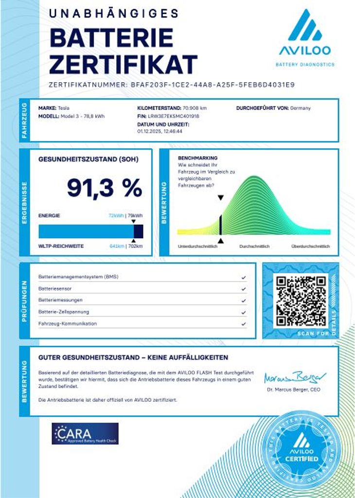 | Doplňující popis: | Tesla Model 3 Long Range Dual Motor - EAP 366kW SOH 91, 3% (ODPOČET DPH) - cena uvedena vč. DPH, baterie 78, 8 kWh - LRW3E7EK5MC401918, dovoz: Německo, elektro, do provozu: 17.11.2021, najeto: 71080 km, pohon kol: 4x4, automatická převodovka, STK do: 2/2028, přední a zadní parkovací senzory, parkovací kamera, přední a zadní vyhřívaná sedadla, vyhřívaný volant, EAP AUTOPILOT ZA 100.000KČ, BOOM BOX, MATRIX SVĚTLOMETY, procesor INTEL ATOM, WLTP 580 km. Záruka na Akumulátor a hnací ústrojí 8 let nebo po ujetí 192000 km (podle toho, co nastane dříve). *MOŽNOST VYKOUPENÍ VAŠEHO STARÉHO VOZU PROTIÚČTEM* *MOŽNOST VÝHODNÉHO FINANCOVÁNÍ už bez nulové akontace* Pro nezávaznou kalkulaci nás neváhejte kontaktovat. Nutno vždy volat předem! Prohlídky možné i mimo pracovní dobu tel. 732710796 Mates auto. Nejedná se o návrh na uzavření smlouvy (nabídku) dle § 1731 zákona č. 89/2012 Sb., občanský zákoník, ale o nezávaznou nabídku., | |
