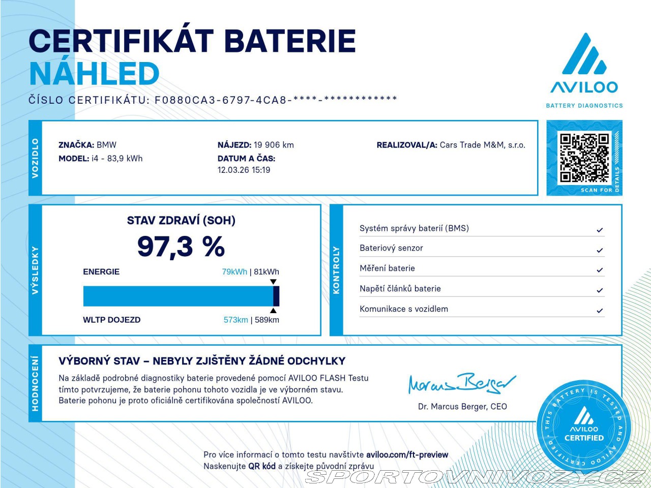 | Doplňující popis: | Na vozidle proběhla nezávislá kontrola baterie s výsledkem 97,3%SoH. Možnost dokoupení záruky na všechny součástky až na 48 měsíců. 100% garance na počet ujetých kilometrů. Prověřené vozy společností Cebia s možností nahlédnutí do výpisu Cebia Reportu. Dále si také můžete nechat prověřit vůz vlastním mechanikem či autorizovaným servisem. Vůz původem z Německa po 1. majiteli. Tato nabídka není návrh na uzavření kupní smlouvy dle zákona 89/2. | |
