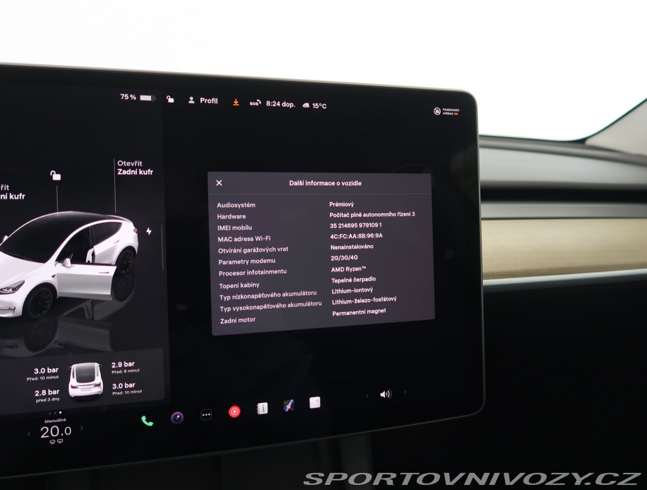 | Nadstandardní výbava: | Tepelné čerpadlo, E-Pedal, ESP, Automatické zastavení před překážkou, paměť nastavení sedadel, automatická klimatizace, navigace, bezklíčkové startování, LED světla pro denní svícení, stereo, dešťový senzor, isofix, elektrické stahování oken, vyhřívaná sedadla, LED hlavní světlomety, Přední a zadní parkovací senzory, zadní světla LED, litá kola, asistent rozjezdu do kopce, kontrola tlaku v pneumatikách, systém pro hlídání mrtvého úhlu, panoramatická střecha, posilovač řízení, Autopilot, systém pro hlídání vybočení z jízdního pruhu, bezklíčkové odemykání, airbag, ABS, vyhřívaný volant, tempomat, elektrické víko kufru, auto. denní svícení, Parkovací kamera, Kabel pro veřejné nabíjení, centrál, kožené sedačky, adaptivní tempomat, multifunkční volant, Loketní opěrka, prémiový audiosystém, Wireless Phone Charging, Automatické nastavování volantu, elektr.sklop.zrcátka, počítač, tónovaná skla, elektricky ovládaná sedadla, Automatická dálková světla, elektrická parkovací brzda, Přední zavazadlový prostor, elektricky ovládaná zrcátka, bluetooth připojení, ASR, Infotainment, Kožený volant, al kola orig., USB-C zásuvka, vyhřívaná zadní sedadla, Rozpoznávání dopravních značek, Volba jízdního režimu, adaptivní světlomety, a mnoho další výbavy, | |
