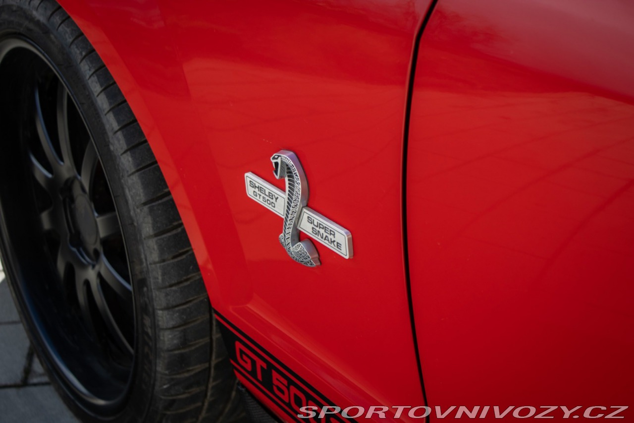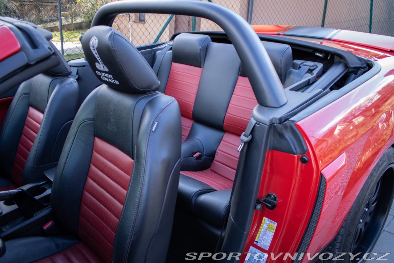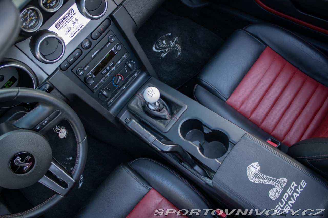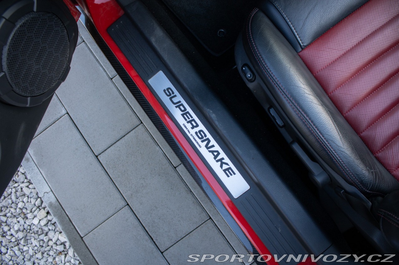 | Nadstandardní výbava: | Výrazne zvýšený výkon oproti štandardnému GT500, upravený podvozok Shelby, Špecifické Super Snake body prvky, označenie CSM (Carroll Shelby Mustang) s jedinečným sériovým číslom, predná kapota s výduchmi, Pretekárske pruhy, 20 Shelby disky kolies, výkonný brzdový systém (Brembo), športový podvozok Shelby, zadný spoiler, prémiový audiosystém, hlinníkové pedále, trakćná kontrola Výbava: ABS, Airbagy, Airbagy - počet, ESP, Systém kontroly tlaku v pneumatikách (TPMS), Autorádio, Elektrické okná, Elektrické sedadlá, Elektrické zrkadlá, Klimatizácia, Kožený interiér, Kožený paket, Lakťová opierka, Multifunkčný volant | |
