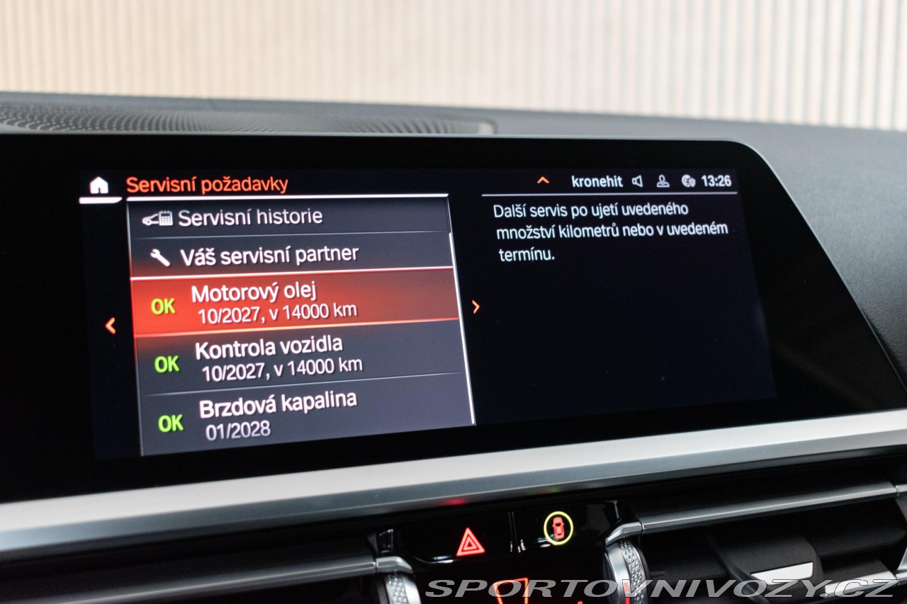 | Doplňující popis: | Vozidlo registrované jako nové v ČR, k vozu sada letních kol, BMW Premium Selection do 29.10 2026. Pravidelně servisováno v BMW, příští servisní interval za 14 000 km. Historie vozidla prověřena společností CEBIA, na vyžádání lze zaslat Cebia report mailem. Z volitelné výbavy: Paket zavazadlový prostor, Paket zrcátek, Aktivní ochrana, Adaptivní M podvozek, Akustická izolace předních bočních oken, Asistent dálkových světlometů, BMW Gesture Control, BMW Head-Up Display, Driving Assistant Professional, Elektricky ovládané tažné zařízení, Kožená přístrojová deska (černá umělá kůže Sensatec) se šedým kontrastním prošitím, Elektricky nastavitelné bederní opěrky předních sedadel, Vyhřívání předních sedadel, Laserové světlomety BMW Laserlight, Parking Assistant Plus, BMW Live Cockpit Professional, Harman Kardon Surround Sound System - 16 reproduktorů (464 W), Příprava pro mobilní telefon s rozhraním Bluetooth včetně bezdrátového dobíjení, Komfortní přístupový systém, Panoramatické elektricky ovládané skleněné střešní okno, WiFi hotspot. Tato nabídka má pouze informativní charakter a neslouží jako podklad pro uzavření objednávky. STOP CARS s.r.o. si vyhrazuje právo uzavření všech smluvních vztahů písemně. | |