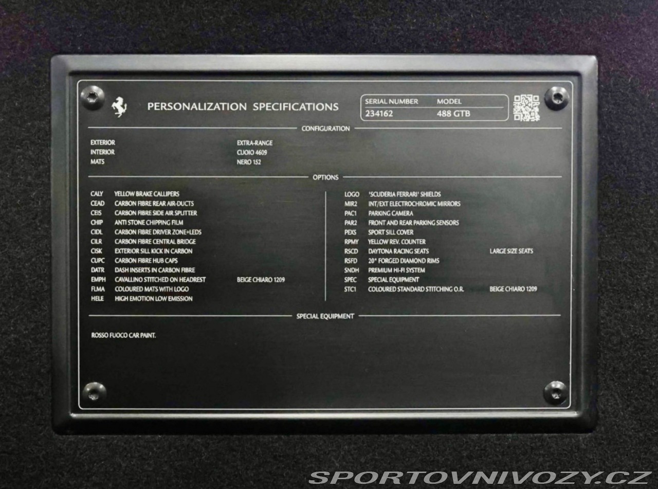 | Doplňující popis: | - Ferrari 488 GTB - Ohromujúca špecifikácia! - Lak Rosso Fuoco - Celokožený interiér Cuoio - Sedadlá Daytona - Kompletná servisná história - Nízky počet najazdených kilometrov - Perfektný stav! | |