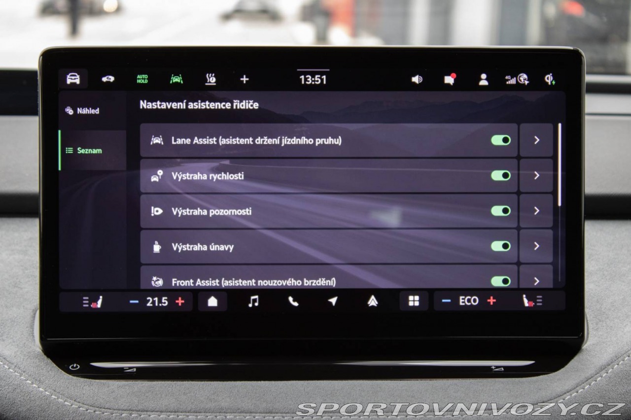 | Nadstandardní výbava: | prémiový sound system CANTON, head-up displej s podporou rozšírenej reality AR, Svetelný pás Light Band, doživotná garancia mobility Výbava: ABS, Adaptívny tempomat, Airbagy, Airbagy - počet, Alarm, ASR, Brzdový asistent, Centrálne zamykanie, Deaktivácia airbagov, EBD, ESP, Imobilizér, Isofix, Natáčacie svetlomety, Systém kontroly tlaku v pneumatikách (TPMS), Asistent rozpoznávania dopravných značiek (ISLW/ISLA), Varovanie o vzdialenosti (BAS Plus), Systém rozpoznania únavy vodiča (DAW), 360° kamera, Systém tiesňového volania (e-Call), Upozornenie premávky za vozidlom (RCTA), Asistent diaľkových svetiel (HBA), Autorádio, Bezdotykové otváranie kufra, Bezkľúčové otváranie dverí, Bezkľúčové štartovanie, Bluetooth handsfree, Diaľkové ovládanie zamykania, Dotykový displej, Elektrické okná, Elektrické sedadlá, Elektrické zrkadlá, Elektrické ovládanie kufra, Fólie, Klimatizácia, Klimatizovaná priehradka, Kožený interiér, Kožený paket, Lakťová opierka, LED svetlomety, LED svietenie, Multifunkčný volant, Navigačný systém, Nezávislé kúrenie, Palubný počítač, Pamäťové sedačky, Parkovacie senzory, Posilňovač riadenia, Sedadlá s masážnou funkciou, Vyhrievané sedačky, Vyhrievané zrkadlá, Vyhrievaný volant, Vonkajší teplomer, Apple CarPlay, Android Auto, Welcome light, WLAN / Wifi Hotspot, Virtuálny kokpit, Matrix svetlá, Bezdrôtové nabíjanie pre smartphony, Ambientné osvetlenie, Asistent jazdných pruhov, Asistent rozjazdu do kopca, Dažďový senzor, Head-up display, Hliníkové disky, Hmlovky, Kontrola mŕtveho uhla, Strešný nosič, Svetelný senzor | |