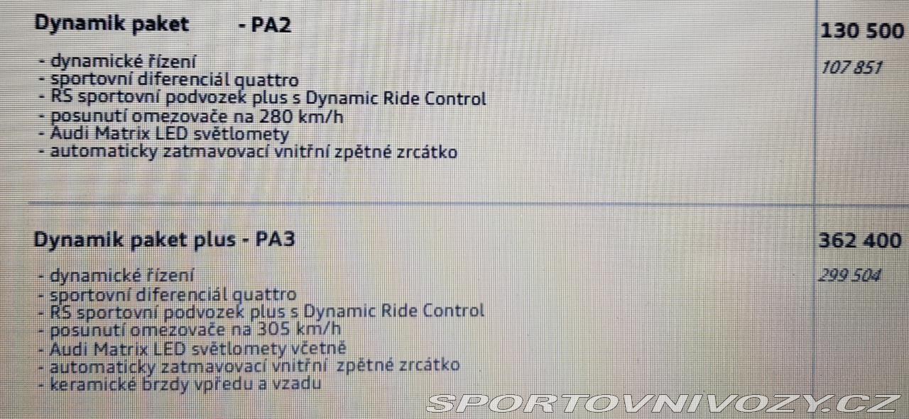 | Nadstandardní výbava: | RS6 3/2015 , 700ps, Dynamic paket 2 ,Vmax 127000km Auto dovoz D,jsem majitel od r.2018 , pravidelný servis, po dobu záruky v Audi. servis-sítko oleje, olejový separátor, zpětný ventil a všechna těsnění, přední ramena, olej po 10tis, poslední servis 3/26 oleje motor, převodovka a diferák DRC sportovní podvozek, sportovní dif., otevřený downpipe, orig.svody s kat. k autu brzdy přední Girodisk , zadní Brembo, JXB performance-zpevnění uložení kardanu, Maxton přední ,zadní, prahy 10 airbag EBD/EBV ABS ESP ASR (TC) DSC (DTC) Natáčecí led matrix Systém kontroly tlaku v pneumatikách (TPMS) Asistent rozpoznávání dopravných značek Kessy bezklíčové zamykání Rádio + DVD El. okna Vyhřívané elektrické sedačky s pamětí Elektrická vyhřívaná zrcátka volant R8, pádla ,start a ovládání jízdních režimů Head-up display,navi,android auto,apple car klima přihrádka ,4 zonová klima Welcome light parkovací asistent ,parkovací kamera hold asist R21 Michelin Pilot Sport nové Kožený interiér a alcantara, alcantara strop Deštový senzor Světelný senzor Stop&start vypnutý Adaptivní tempomat EDS akustické a determální skla, Bosse Soundsystem leštěný lak a vosk,v zimě v garáži prodej z důvodů koupě nové, info na tel. | |