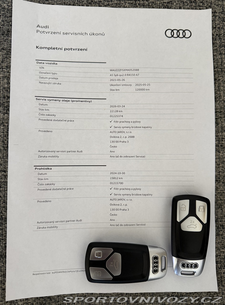 | Nadstandardní výbava: | Prodám v zastoupení vůz: Audi A5 Sportback 2.0 40 TFSI S line Quattro po prvním majiteli. Výkon: 150 kW První registrace: 05/2021 Počet ujetých km: 22 XXX km Palivo: Benzín Objem motoru: 1984 ccm Převodovka: Automat Počet sedadel: 5 Stav vozidla: Použité vozidlo Barva: Ibis White T9 Původ: ČR - první majitel Servisní historie Audi - poslední výměna oleje 03/26 Dálniční známka do 02.01.2027 2x klíč, 7-stupňová automatická převodovka, 3-zónová automatická klimatizace, elektrický kufr, 4x keyless, zadní kamera, vyhřívané přední sedačky, CarPlay, navigace, indukční nabíječka telefonů, hlasové ovládání, zatmavená skla… Kompletní seznam výbavy nebo VIN na vyžádání. Auto bylo pravidelně servisováno v autorizovaném servisu Audi a veškerá potřebná údržba byla vždy provedena. V případě zájmu je možné vozidlo nechat zkontrolovat v libovolném servisu. Odpočet DPH možný. Uvedená cena s DPH Pouze prodej, výměna není možná. Důvod prodeje, pořízení nového vozidla. Možnost zajištění financování nebo pojištění vozu. Více informaci po telefonu. | |