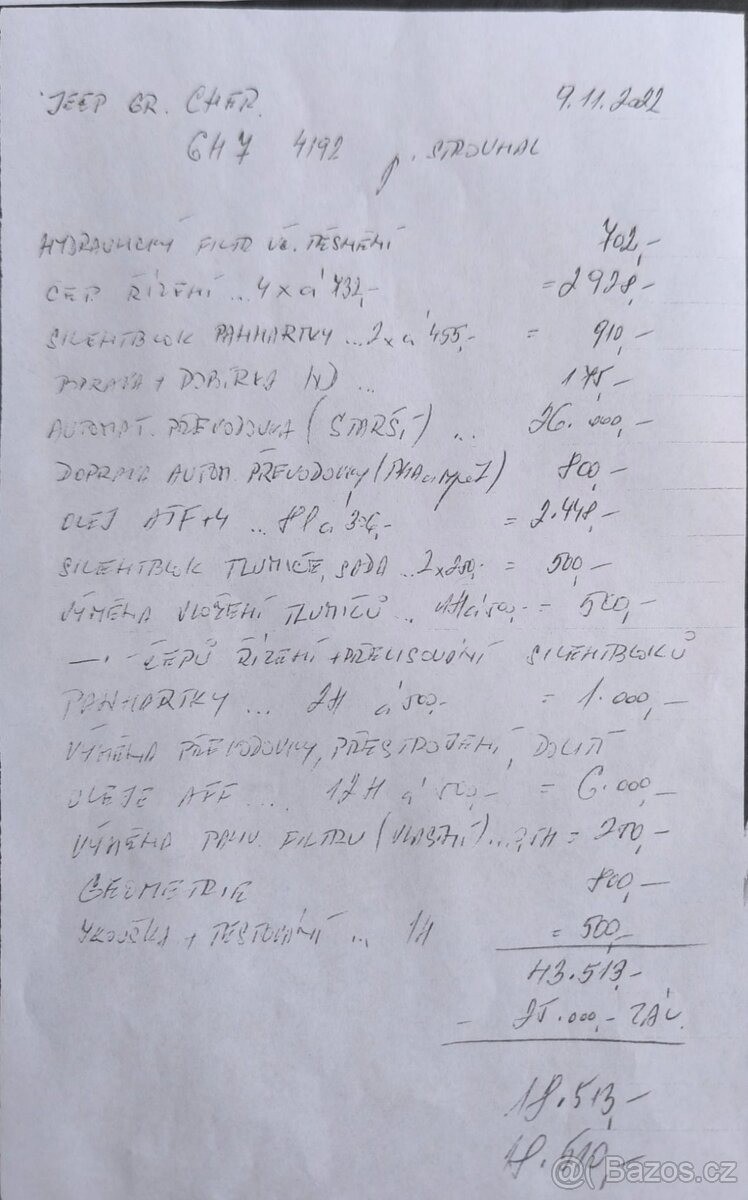 | Doplňující popis: | TEL: 739434118 OKR: ČESKÝ KRUMLOV Jeep Grand Cherokee 2.7 CRD Prodám spolehlivý Jeep Grand Cherokee z roku 2004 s osvědčeným motorem 2.7 diesel. Ideální parťák na cesty, do práce i na dobrodružnější výlety. S nájezdem 224 867 km a platnou technickou do ledna 2027. Motorizace: 2.7 CRD (diesel) Rok výroby: 2004 Stav tachometru: 224 867 km Barva: stříbrná metalíza STK: do ledna 2027 Výbava a servis: Druhá sada kol: K vozu přidám sadu R19 s pneumatikami na dojetí. Bohatá historie: Po předchozím majiteli proběhl velký servis (viz přiložené foto). Co jsem udělal já: Nové brzdové třmeny a destičky, ložiska, výměna oleje v motoru i převodovce, nová ramena náprav, baterie, panhardka, čepy, převodka řízení a další. Auto je poctivě servisované a připravené na další kilometry. Proč prodávám: Již ho nevyužívám, ale vím, že to je skvělý pomocník a pracovní parťák. Cena: 138 000 Kč (možnost jednat o ceně) Prosím jen vážný a seriózní zájemce. Kontakt: 739 434 118, | |