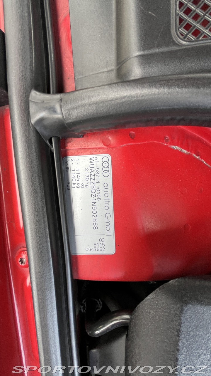 | Doplňující popis: | Nabízím k prodeji svou Audi RS4 b5 Vzhledem ke skutečnosti, že auto za poslední dva roky najelo dohromady sotva 2000km a v životě se priority mění, tak jsem dospěl k závěru, že by mohlo dělat opět radost někde jinde. RS4 vlastním od 02/2020 od té doby najeto necelých 15tkm. Dnes již legendární vozidlo Audi, které se výrazně otisko do historie automobilky Audi, potažmo sportovní divize Quattro GmBh Audi RS4 B5 Quattro, r.v. 2001, 2,7l V6 Bi-turbo , manuální převodovka 6st. - Nájezd 179 xxx km - Na svůj věk v perfektním stavu, jak interiér, tak exteriér - Karoserie absolutně bez koroze - Interiér černá kůže, karbon dekor, originál černý strop - Podvozek D2 racing, nastavitelná výška, tuhost - Přední brzdy 8-pístky z RS4 B7 - Pancéřové brzdové hadičky - Komplet dělaný nerezový výfuk včetně downpipes 3,5“ - Úprava SW na 420PS / 600Nm - Pravidelně měněný olej 1x za rok Millers Oils 5W-50 (včetně filtru samozřejmě) - Antiradar (pevná skrytá montáž) - Multimediální vstup USB/SD karta/AUX (X-carlink) - jinak sériový stav Jediný nedostatek je, že někde z vrchu motoru (od vík) prosakuje olej, což je u 25let starého auta asi pochopitelné, nicméně toto bude ještě před prodejem vyřešeno, a preventivně budou udělány i komplet rozvody. V případě, že by měl někdo zájem koupit s tímto nedostatkem, není problém se domluvit na slevě z celkové ceny… rozumní lidé se domluví vždy. | |