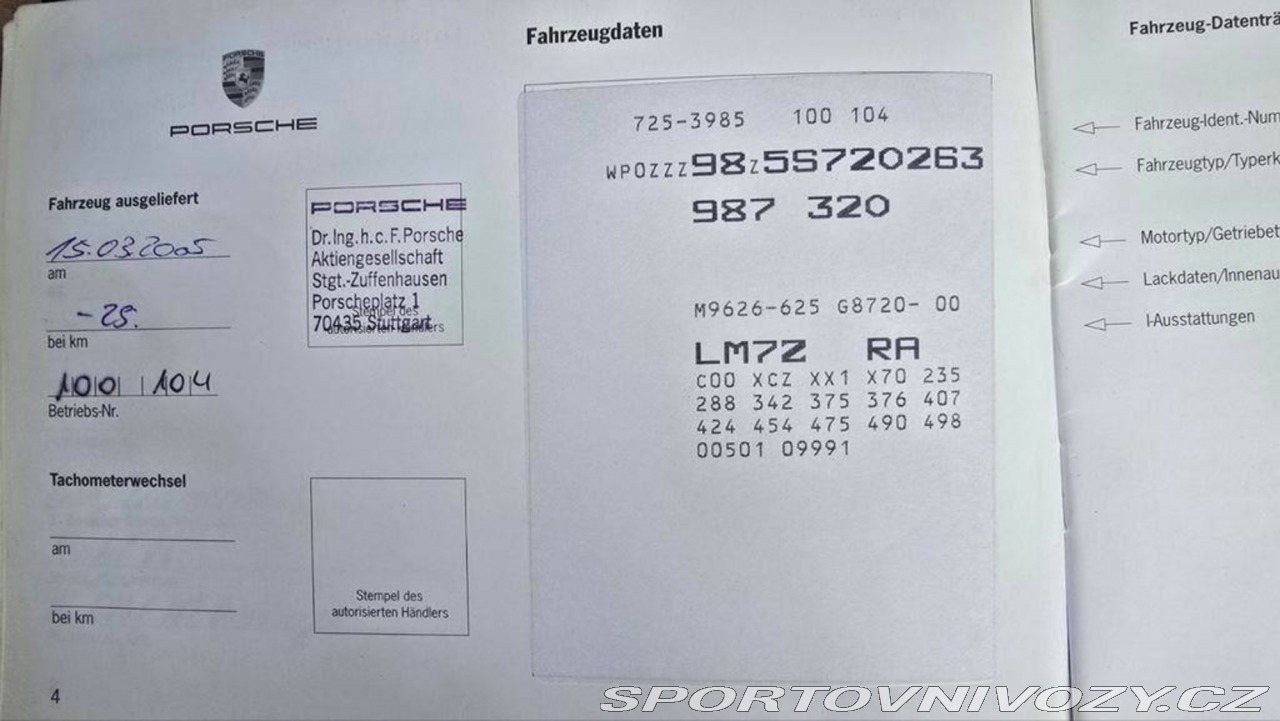 | Doplňující popis: | Porsche Boxster S 3.4 z roku 2005 v provedení GT Silver s manuální šestistupňovou převodovkou. Auto má najeto 221 621 km a pohání ho benzínový motor o objemu 3,4 litru s výkonem 310 koní. Jedná se o kabriolet s karoserií roadster a pohonem zadních kol, který nabízí sportovní a velmi zábavný jízdní projev. Vozidlo je v hnědém koženém interiéru, má dvoumístné uspořádání a je vybaveno sportovními sedadly s vyhříváním. Mezi úpravy patří sportovní podvozek Intrax 1K2, zkrácené řazení, upravený výfukový systém a modernizované audio s vylepšenými reproduktory. Dále je vybaveno nerezovými prahovými lištami a sportovními polepy Porsche. Technicky je vůz ve velmi dobrém stavu a v minulosti došlo k výměně motoru i převodovky v roce 2018. Současný motor je z roku 2008 a má prokazatelně nižší nájezd, přičemž od jeho montáže bylo najeto přibližně 70 000 km bez problémů. Celkově má motor odhadem méně než 150 000 km. Auto bylo posledních 8 let pečlivě udržováno a má doloženou servisní historii včetně originální servisní knížky. Vůz je inzerován formou zakázkového dovozu ze zahraničí. Cena zahrnuje prověření a prohlídku vozu i jeho dopravu do ČR. Veteráni na Truc: parta normálních lidí, kteří milují auta. Desítky aut máme skladem v naší péči a další připravené k dovozu. Rozumíme vašim potřebám, jsme k dispozici pro vaší plnou spokojenost, protože ta je naším cílem. Umíme toho víc – například veškeré dokumenty nutné pro přihlášení vyřídíme rychle a efektivně. Více informací ochotně poskytneme na telefonním čísle +420723510286 (i Whatsapp). Umíme vyřešit dovoz vašeho vysněného auta odkudkoliv (ať už klasického nebo nového) včetně registrace, pojištění a dalších souvisejících služeb. | |
