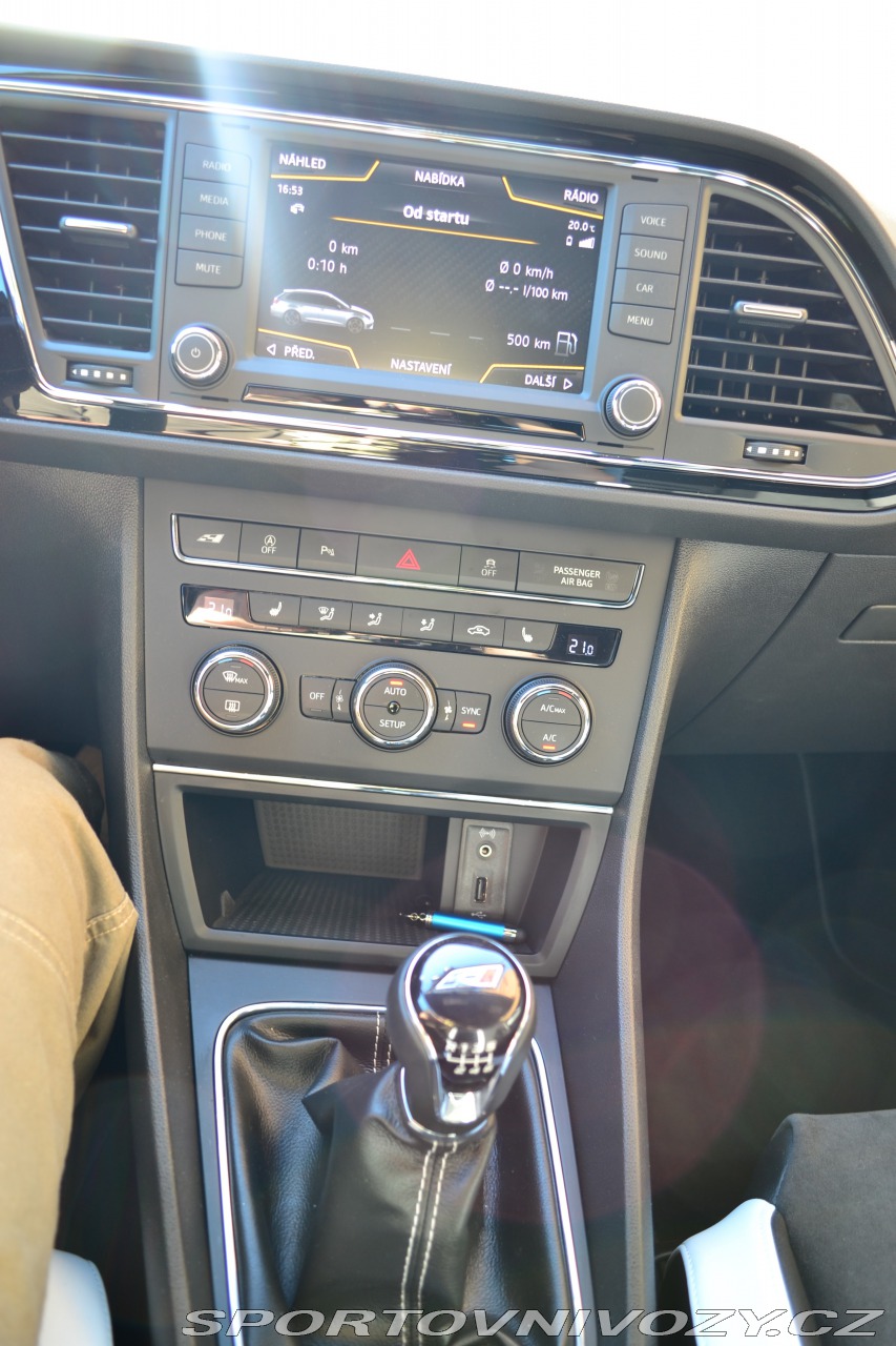 | Nadstandardní výbava: | Packet Performance - 4 pístkové brzdy Brembo, skořepinová sedadla (Alcantara). Zadní parkovací kamera, vyhřívané sedačky, adaptivní tempomat, dělící síť, Android Auto, Apple CarPlay, parkovací senzory vpředu a vzdadu, Seat Sound System. | |