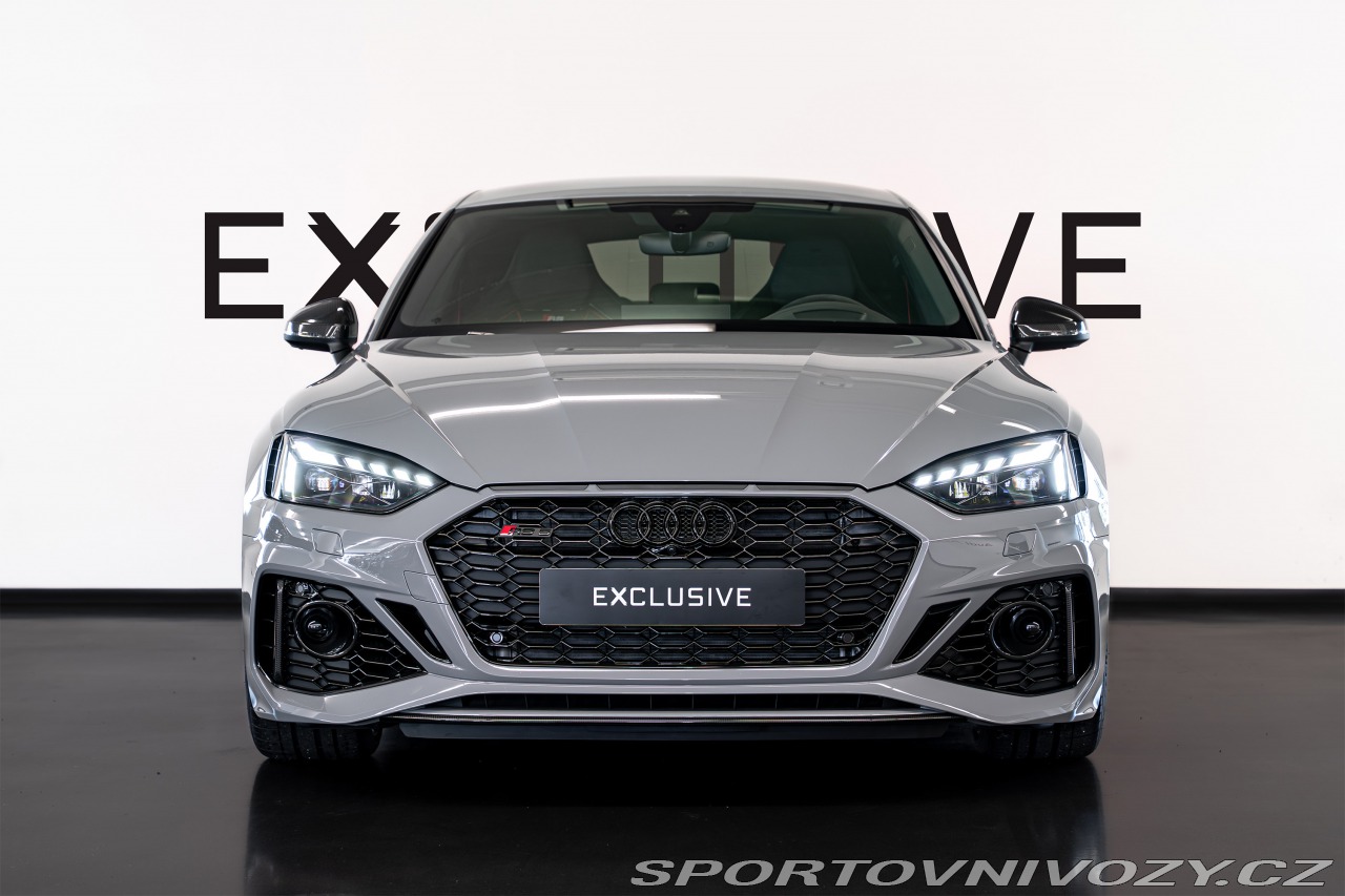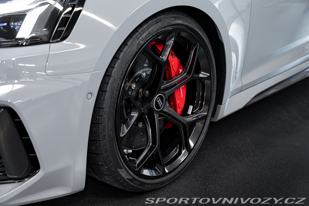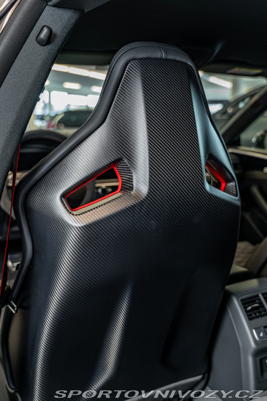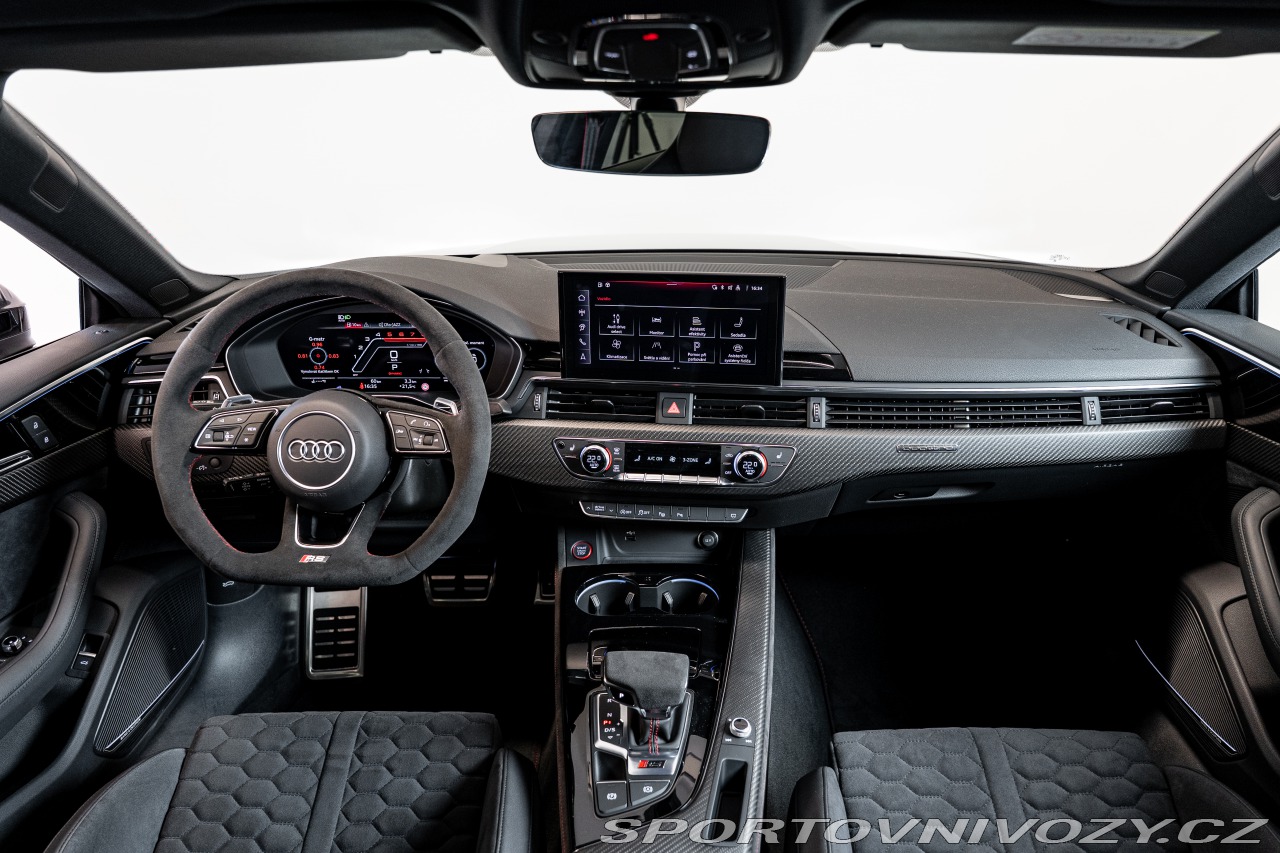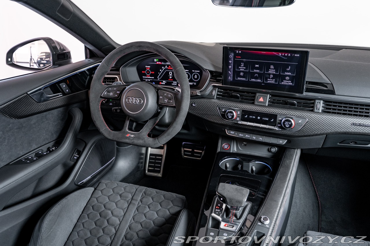 | Nadstandardní výbava: | Competition Plus paket: Nejostřejší verze RS 5 s upraveným podvozkem, diferenciálem a softwarem převodovky. Manuálně nastavitelný podvozek a sníženou zvukovou izolaci pro intenzivnější zážitek z jízdy. RS karbon-keramické brzdy. 20" kovaná kola: 5 paprskový Y design v exkluzivním lakování černá Phantom. Matrix LED světlomety. 360° kamery snímající okolí. Head-up displej. Audio: Prémiový surround systém Bang & Olufsen. Konektivita: Audi smartphone interface (Apple CarPlay/Android Auto), Audi obchod s aplikacemi, Audi phone box a Audi connect klíč. 3 zónová automatická klimatizace, komfortní klíč (bezklíčový přístup), dálkové ovládání garážových vrat a zatmavená skla. Zimní výbava: Paket pro zimní období a paket odkládacích prostor. Prodloužená tovární záruka: Platná na 5 let / 150 000 km. Bezpečnost: Boční airbagy i pro zadní sedadla. | |