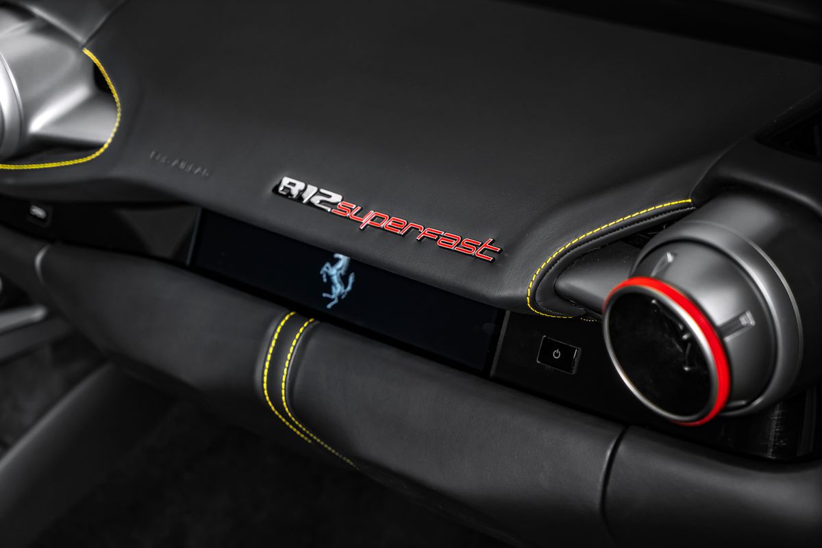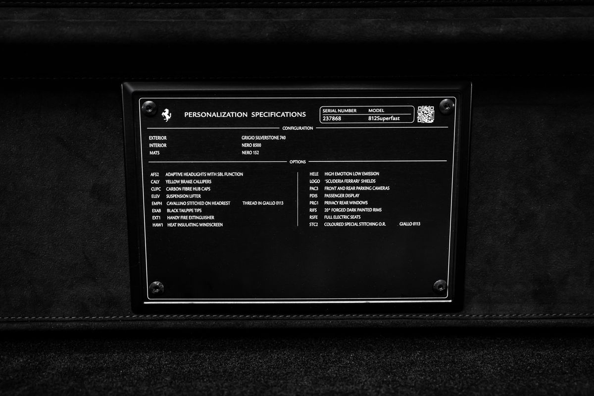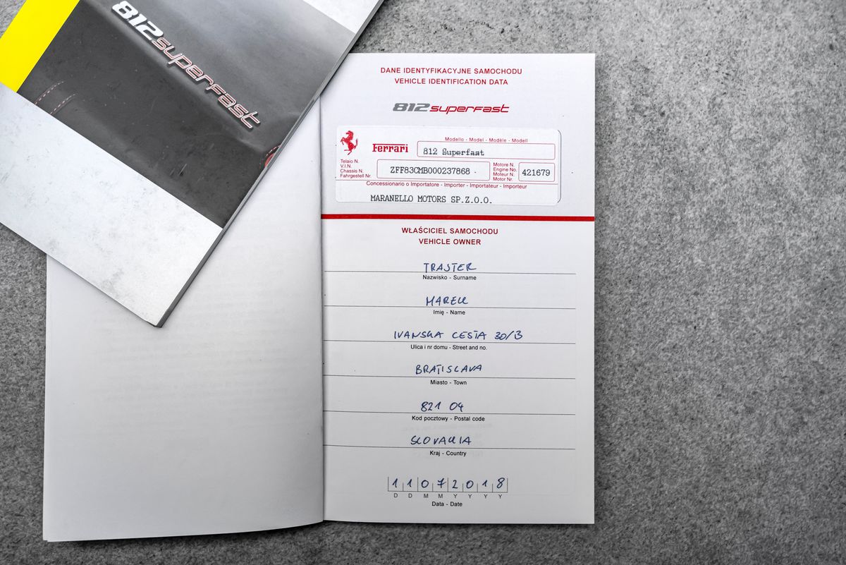 | Doplňující popis: | Bratislava, FERRARI 812 SUPERFAST EXTERIÉR: Grigio Silverstone 740 Adaptívne svetlomety s funkciou SBL Žlté brzdové strmene Stredové krytky kolies z karbónových vlákien Zdvihací systém podvozka (suspension lifter) Vyšitý znak Cavallino (koník) na opierkach hlavy Čierne koncovky výfuku Hasiaci prístroj Tepelnoizolačné čelné sklo Šitie v odtieni Giallo (žltá) Erby „Scuderia Ferrari“ na blatníkoch Predné a zadné parkovacie senzory vrátane kamier Displej pre spolujazdca Zadné zatmavené (súkromné) sklá 20” kované disky v tmavej farbe Plne elektricky nastaviteľné sedadlá Farebné kontrastné prešívanie (špeciálne vyhotovenie) | |